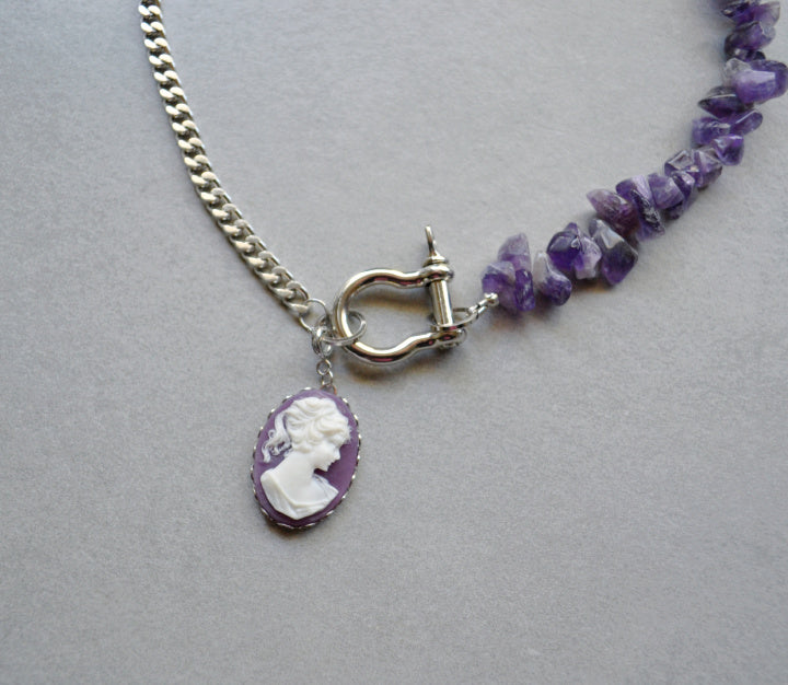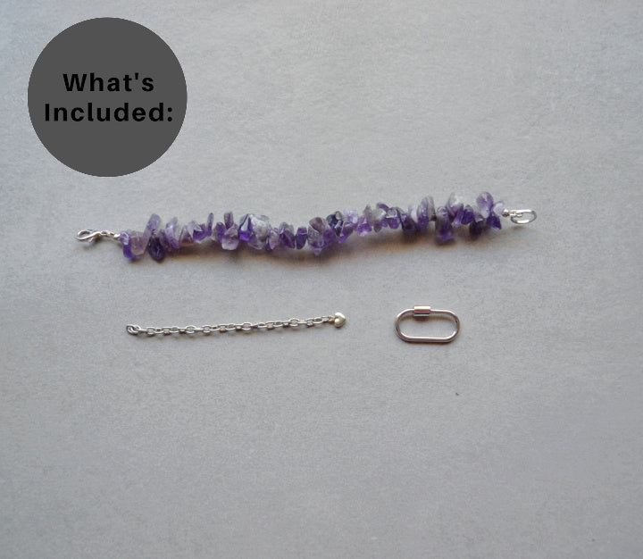 Amethyst half, a screw on carabiner clasp, and a removable 3 inch extender
