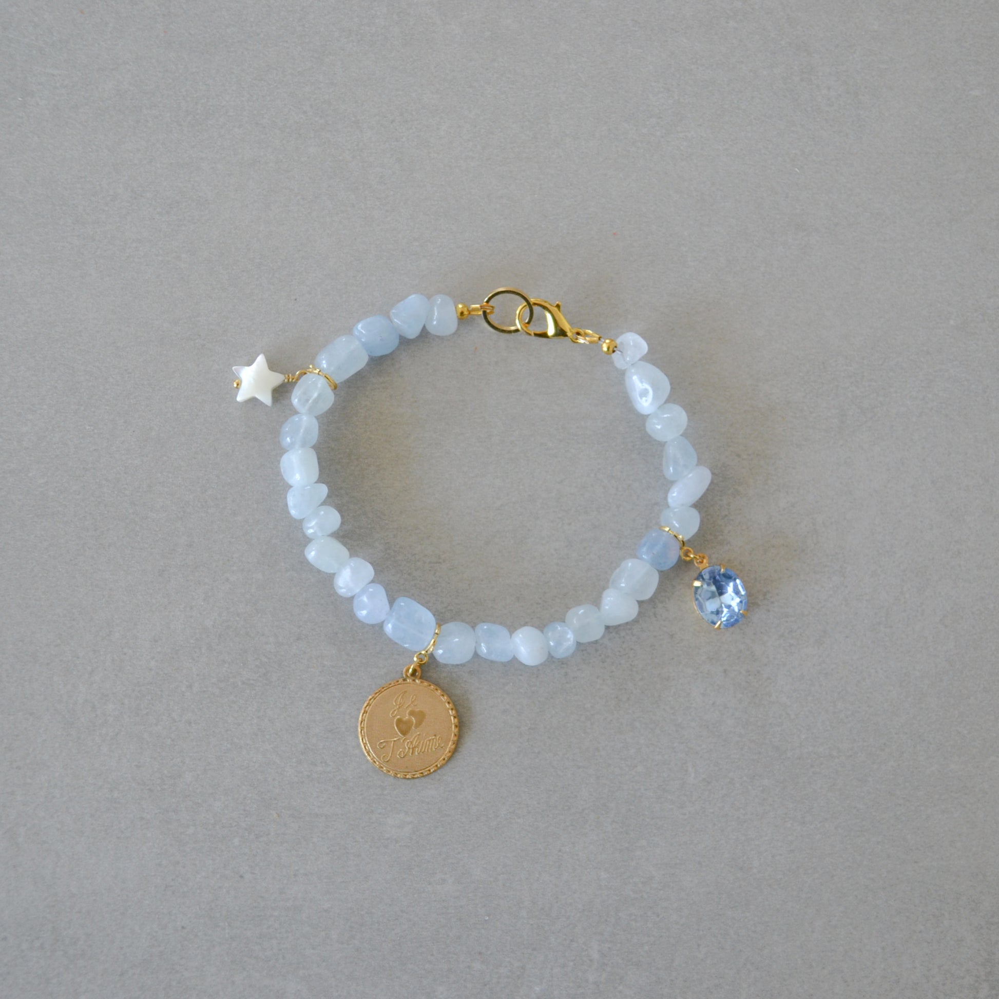 Made with aquamarine beads and 18k gold plated findings with hypoallergenic, water-resistant, and tarnish-proof clear coating