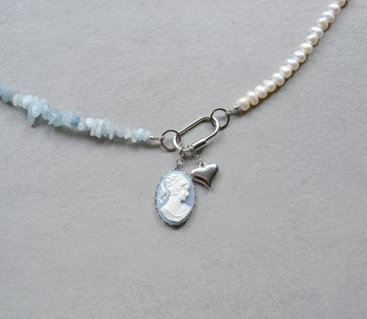 Aquamarine half, a screw on carabiner clasp, and a removable 3 inch extender