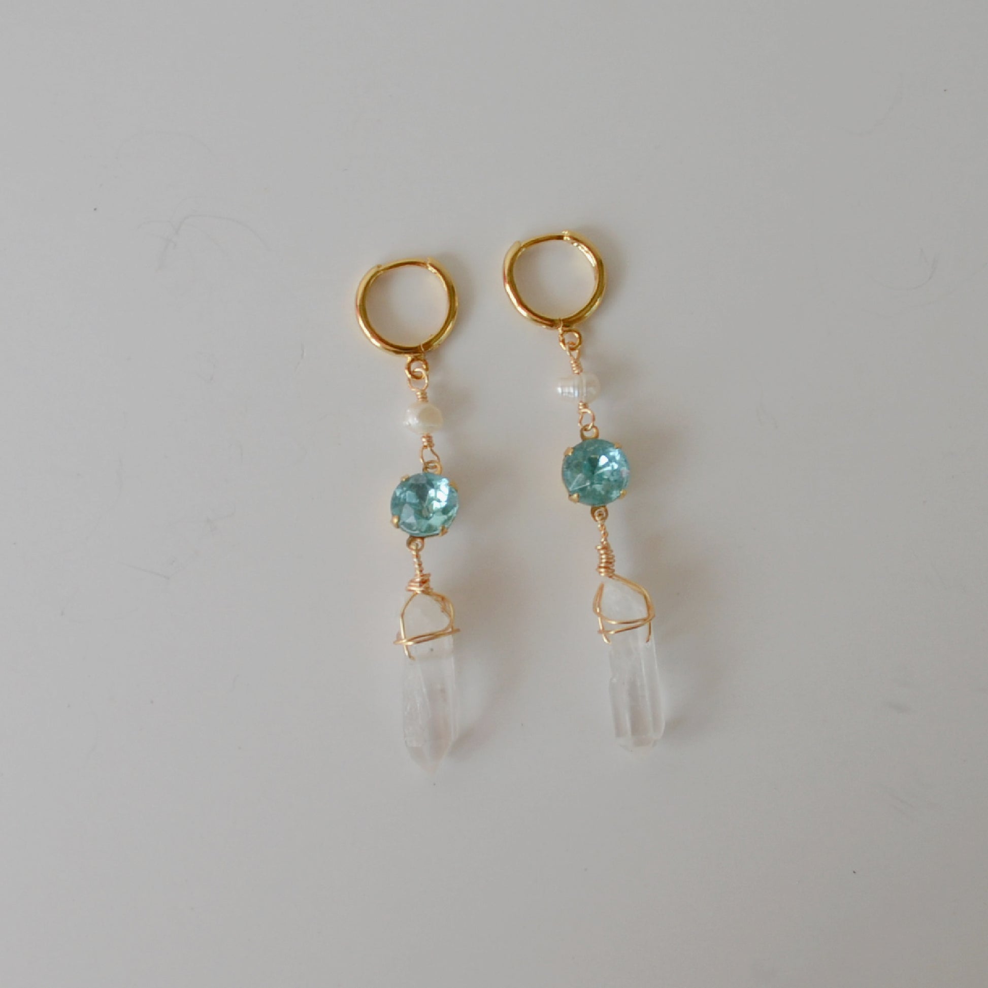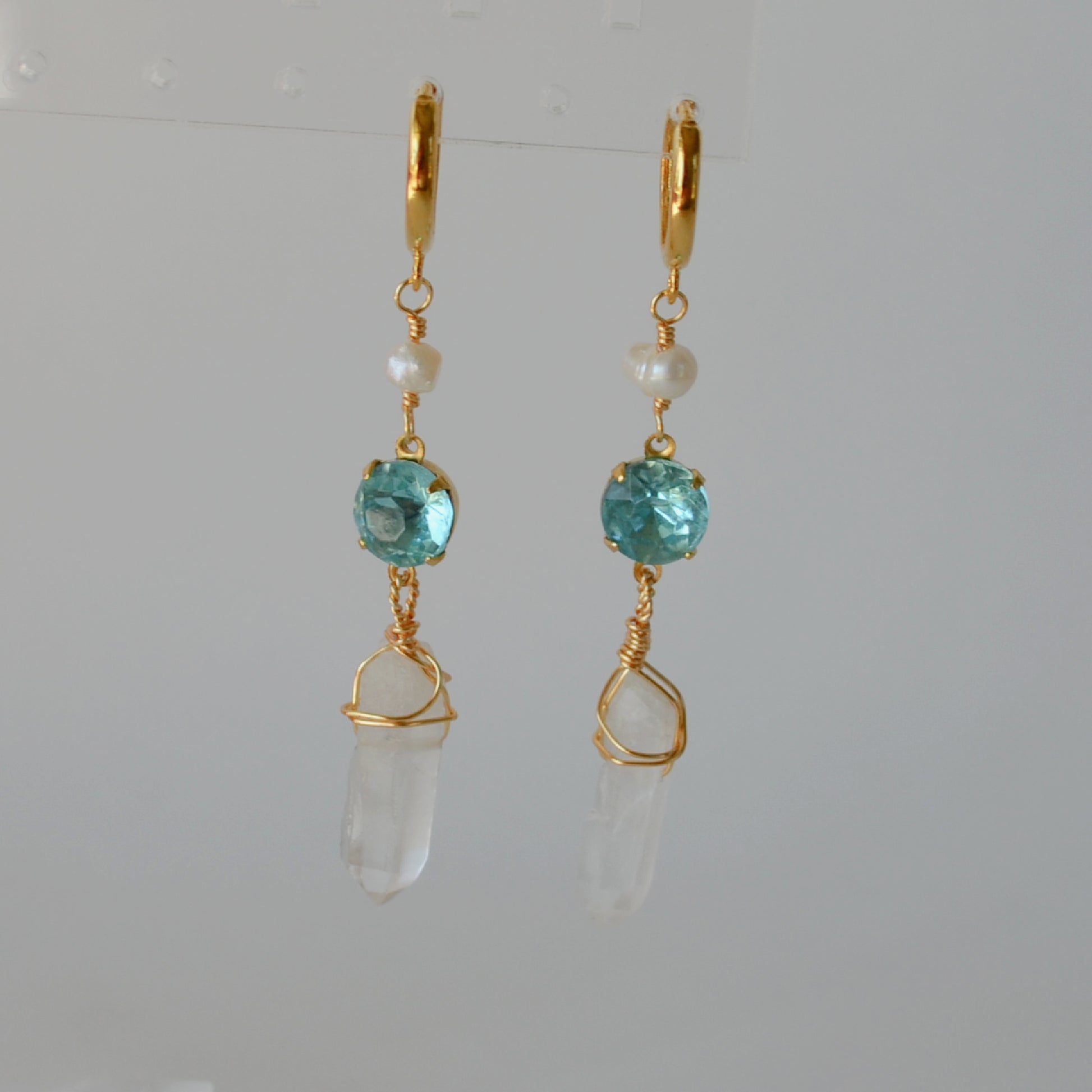 Handmade huggie hoop earrings made with vintage aqua crystals, freshwater pearls, clear quartz, and gold plated earring hoops