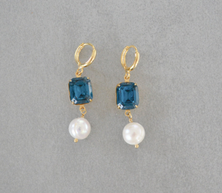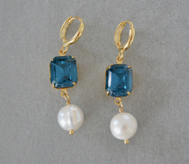 Handmade huggie earrings made with teal vintage glass crystals , large freshwater pearls, and gold plated hoops