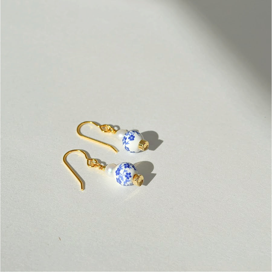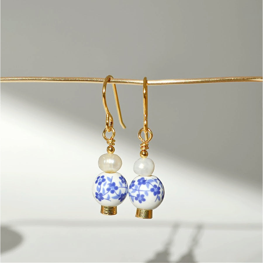 Handmade earrings made with freshwater pearls, painted cermaic beads, and gold plated earring hooks