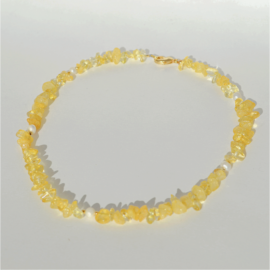 Handmade necklace made with citrine crystals, freshwater pearls, and rhodium plated findings.