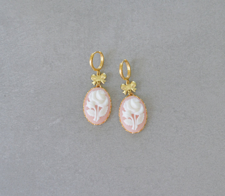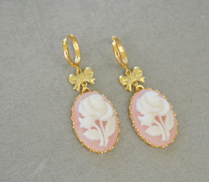 Handmade earrings made with vintage solid brass bows, pink rose vintage cameos and gold plated huggie hoops