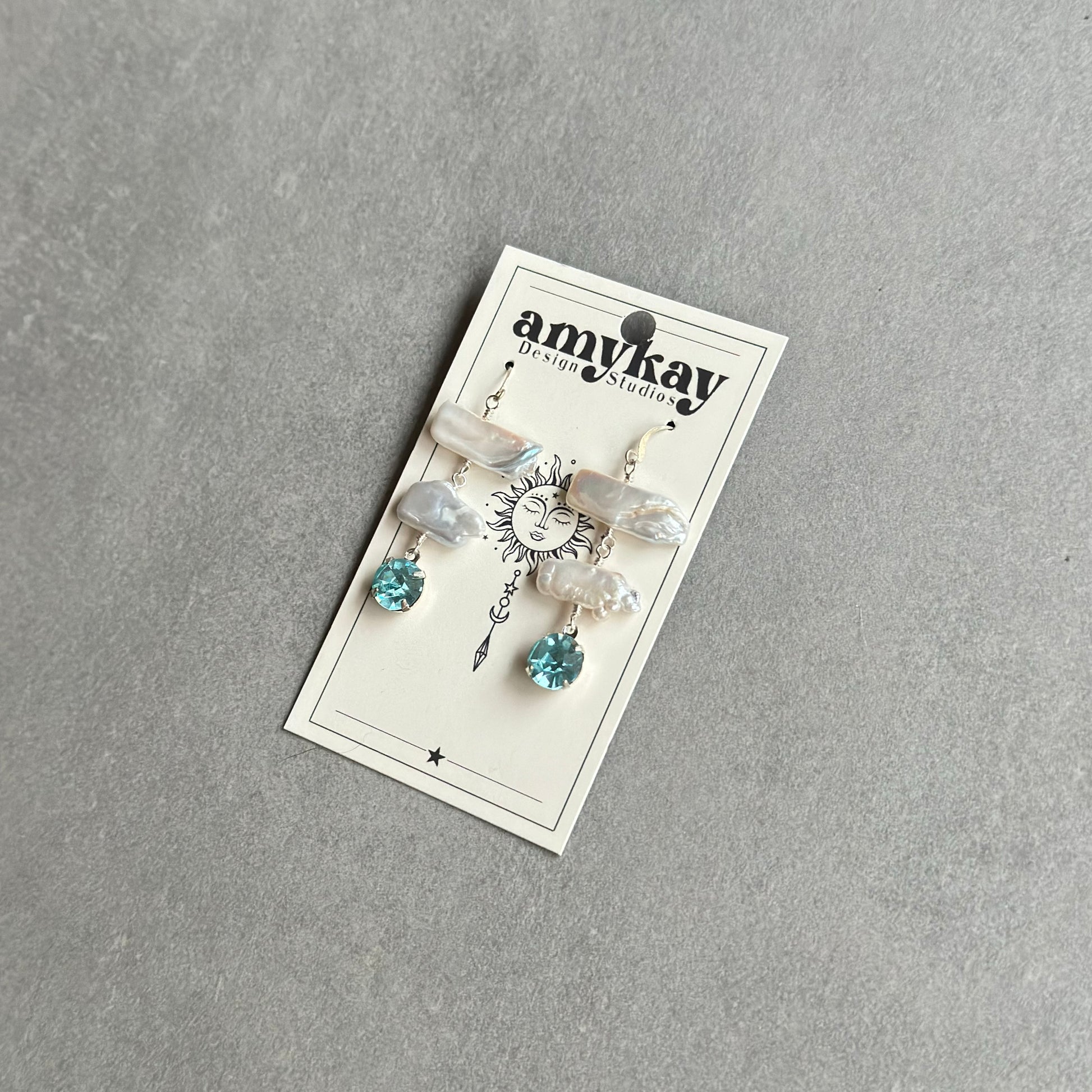Handmade earrings made with freshwater stick pearls, vintage aqua crystals, and sterling silver earring hooks.