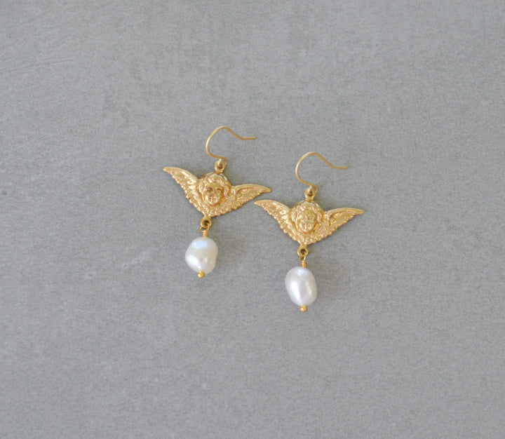 Handmade earrings made with vintage solid brass angels, freshwater pearls and gold plated earring hooks