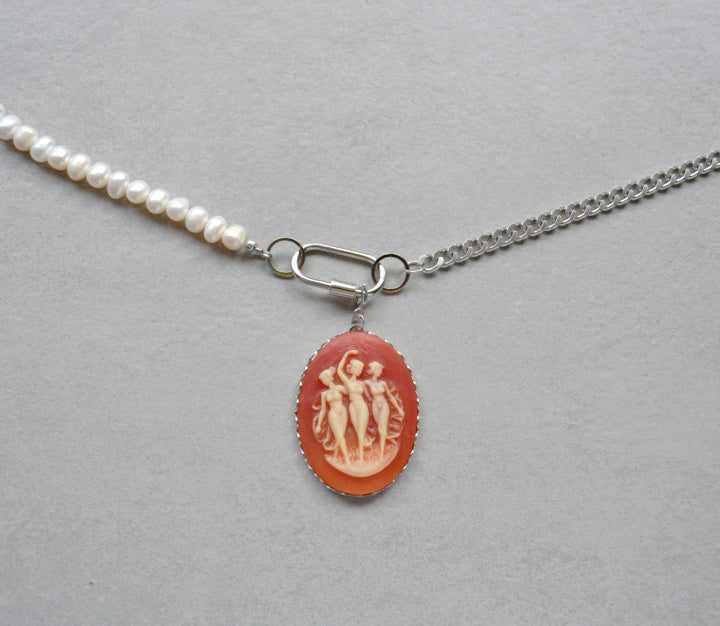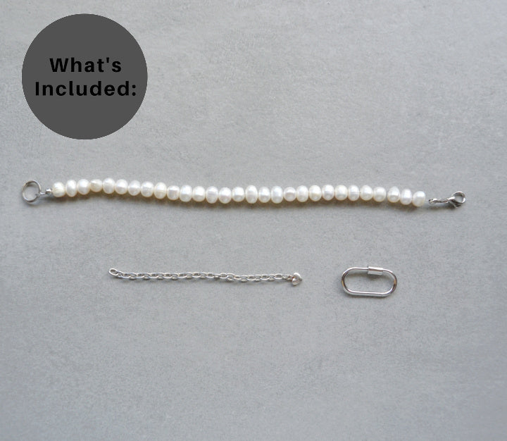 Freshwater pearl half, a screw on carabiner clasp, and a removable 3 inch extender