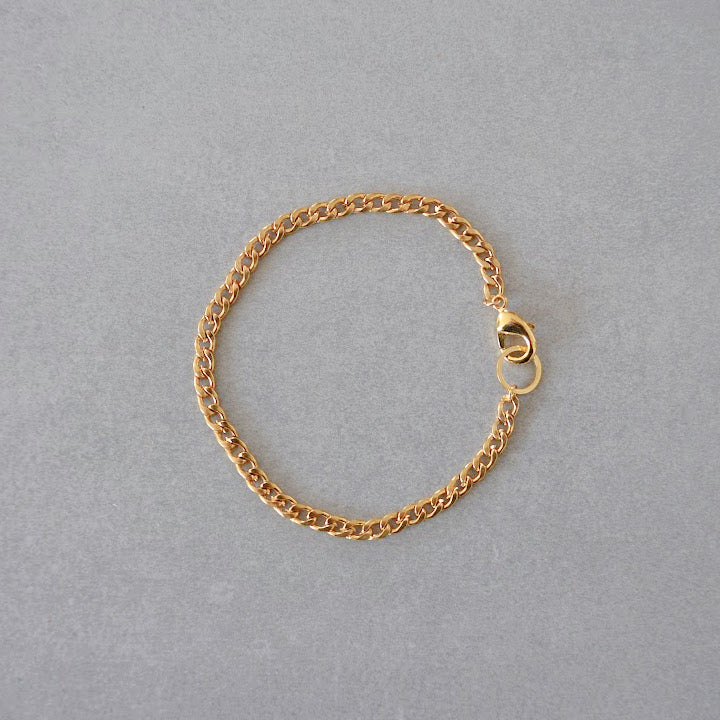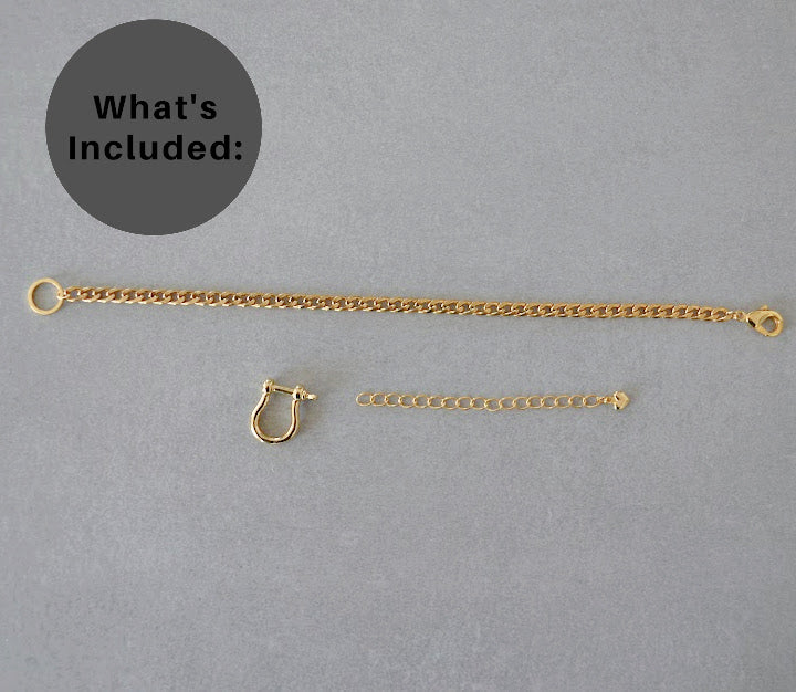 Gold curb chain half, a screw on shackle clasp, and a removable 3 inch extender