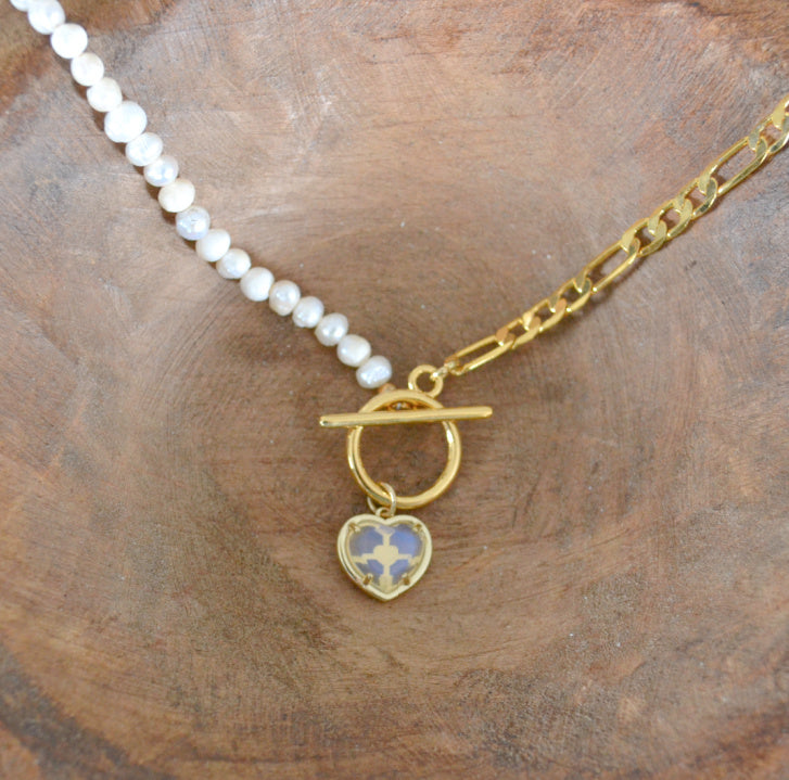 Handmade necklace made with freshwater pearls, gold plated chain, and a moonstone heart charm