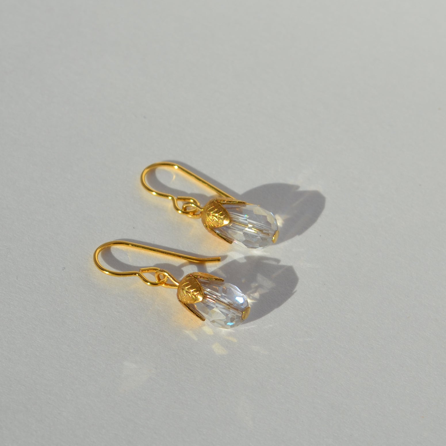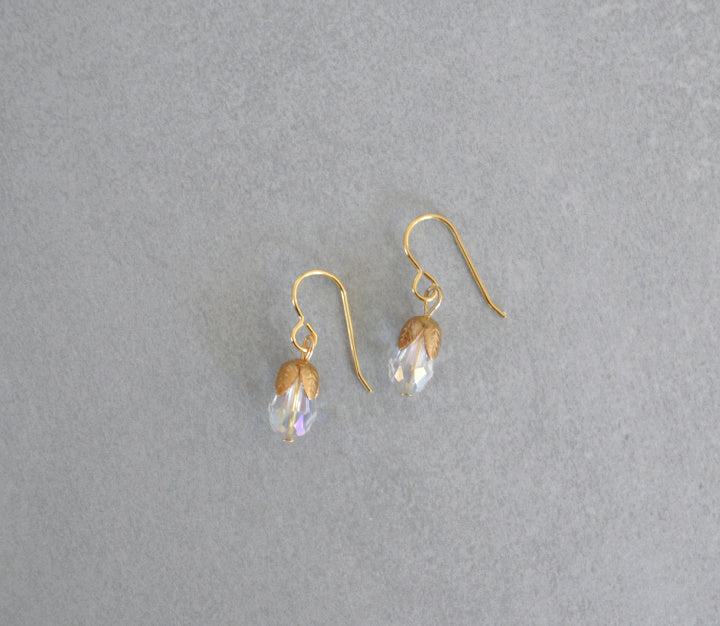 Handmade drop earrings made with iridescent glass crystals and gold plated earring hooks