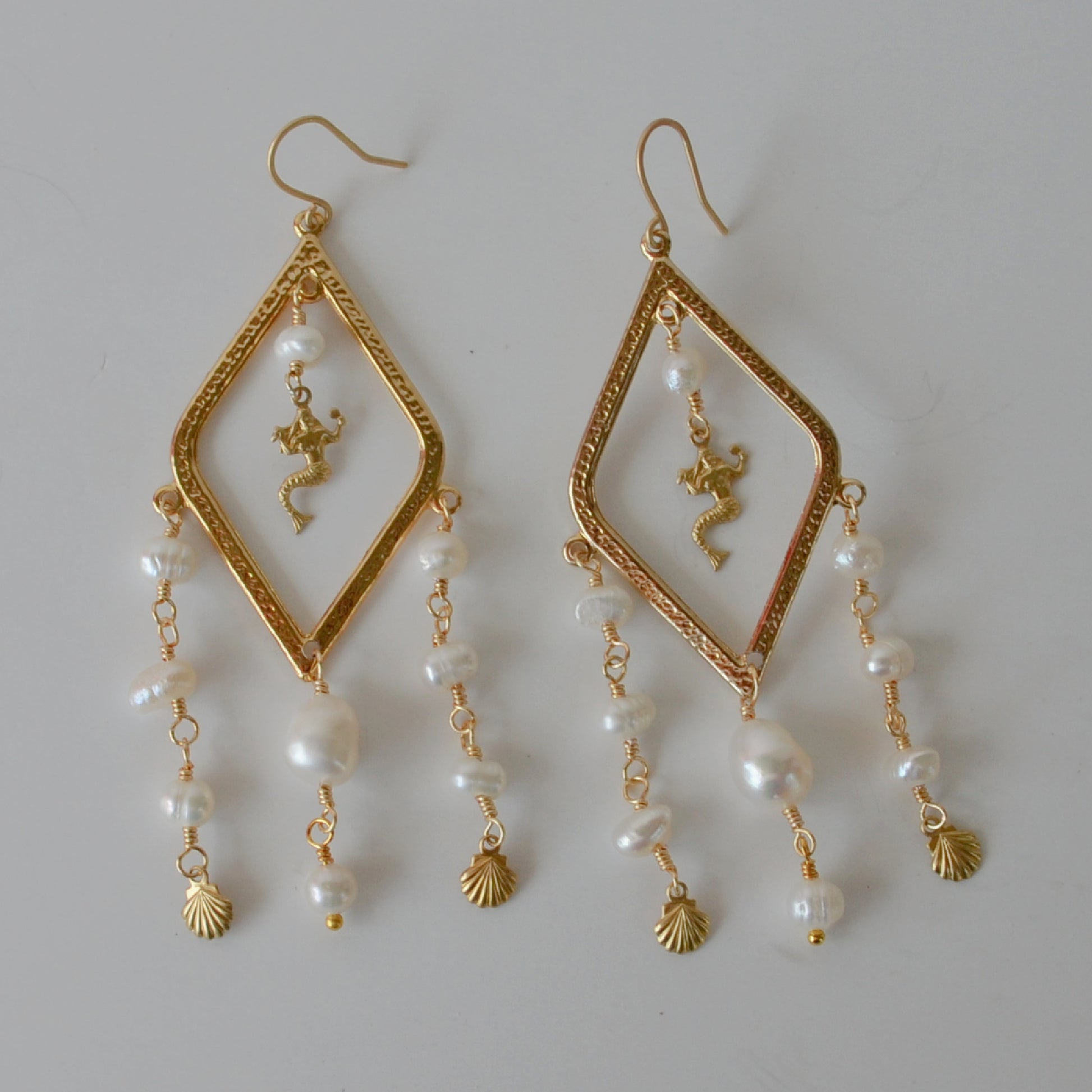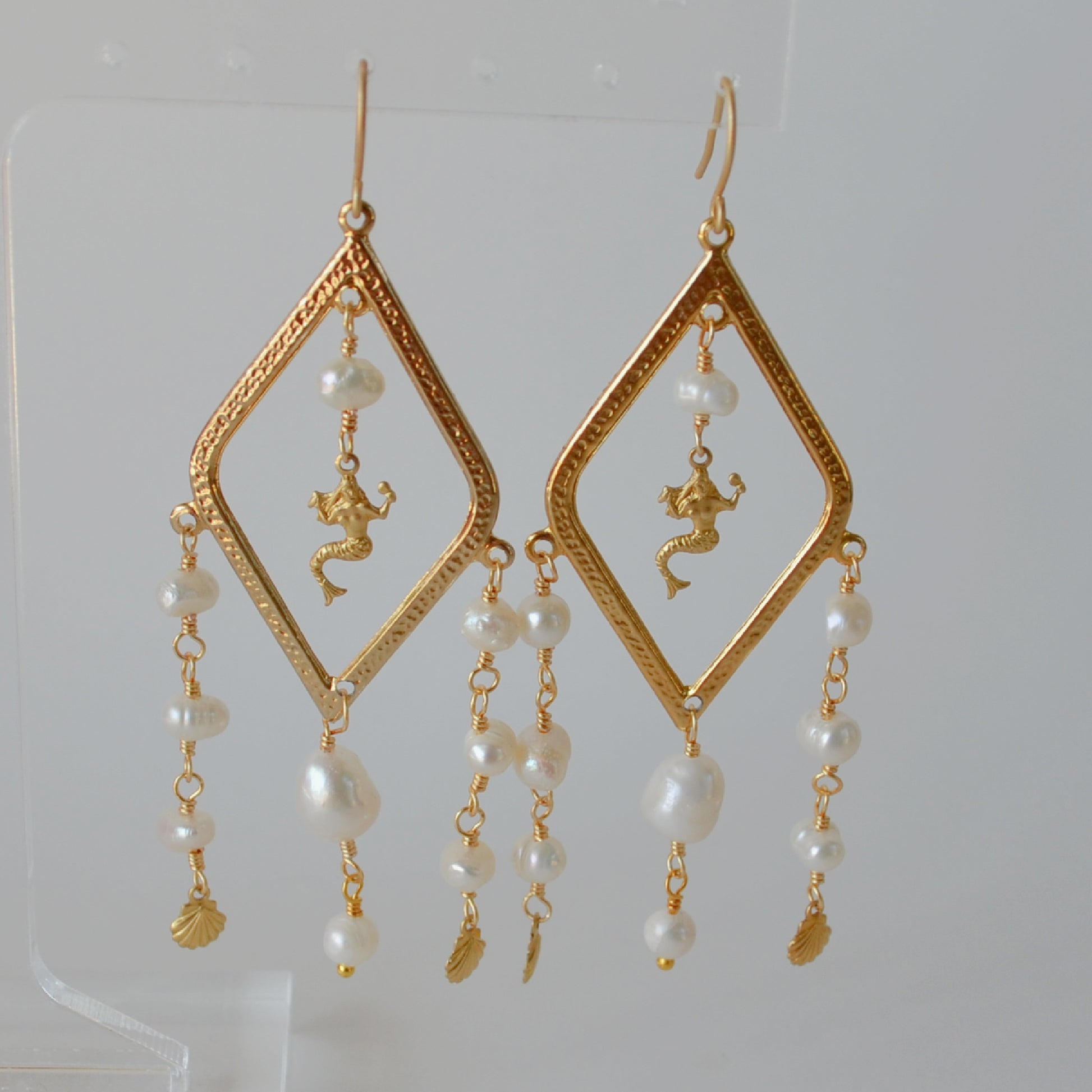 Handmade chandelier earrings made with mermaid and seashell charms, freshwater pearls, gold plated findings and earring hooks