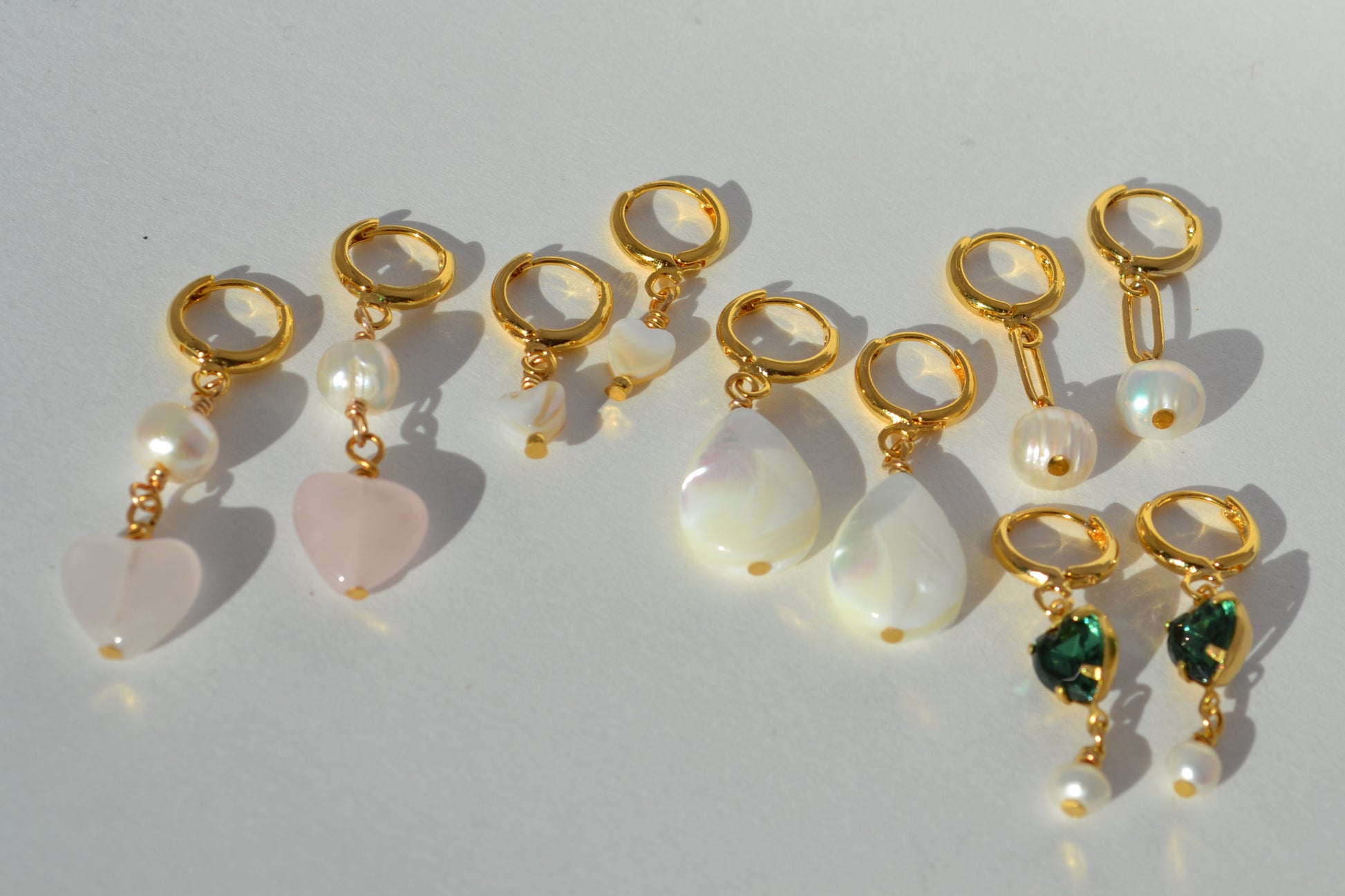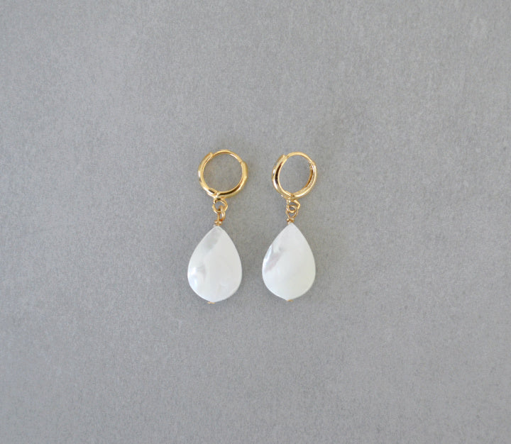 Handmade huggie earrings made with mother of pearl teardrops and gold plated hoops