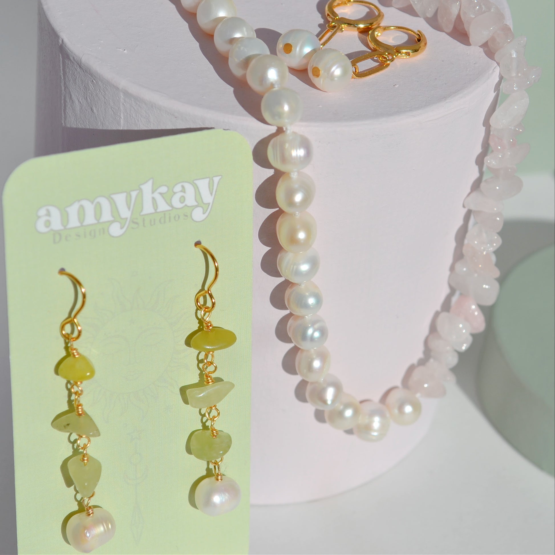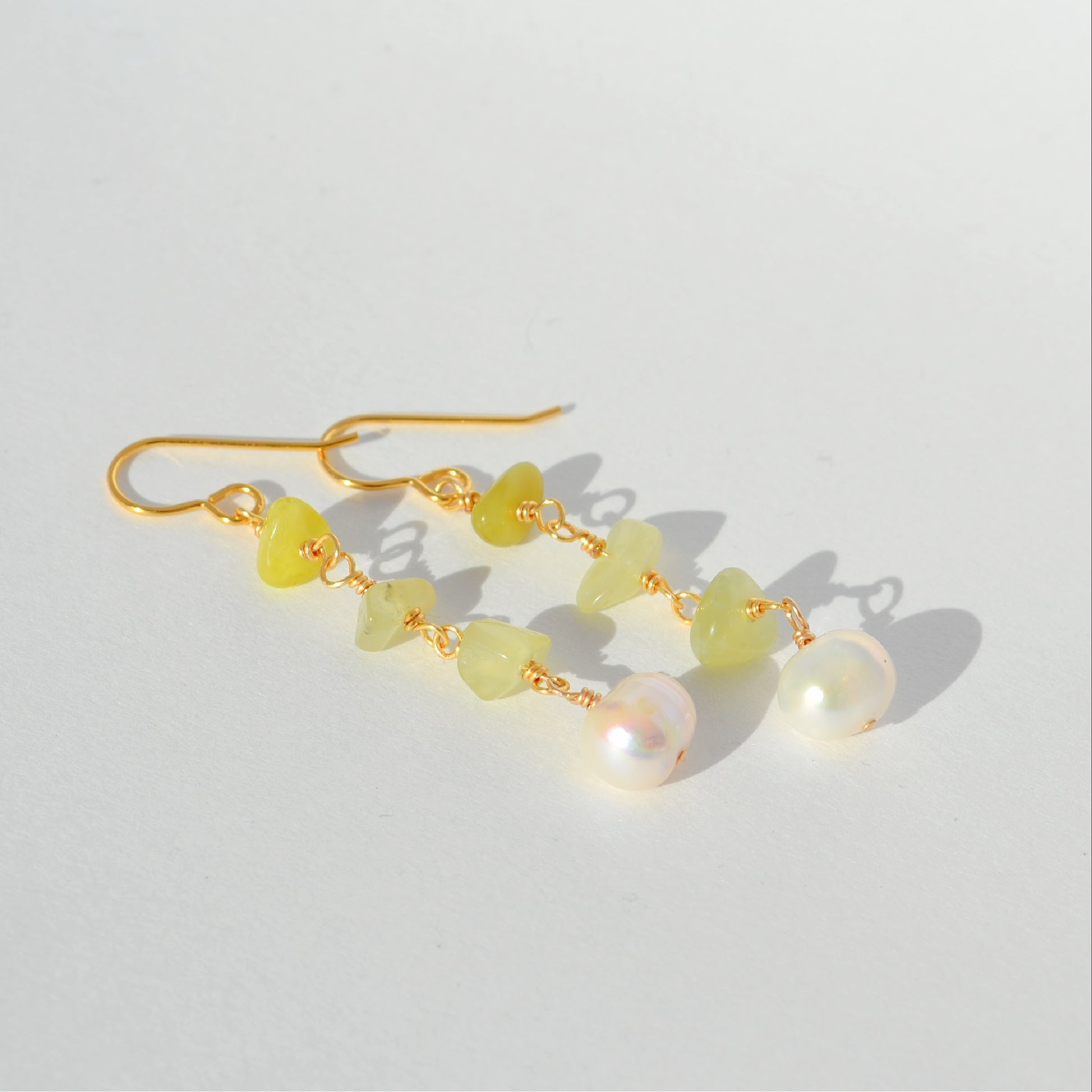 Handmade earrings made with serpentine crystals, freshwater pearls, and gold plated earring hooks