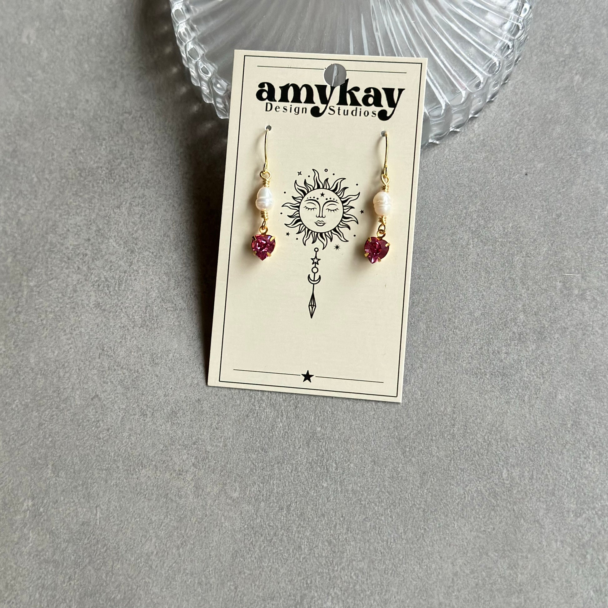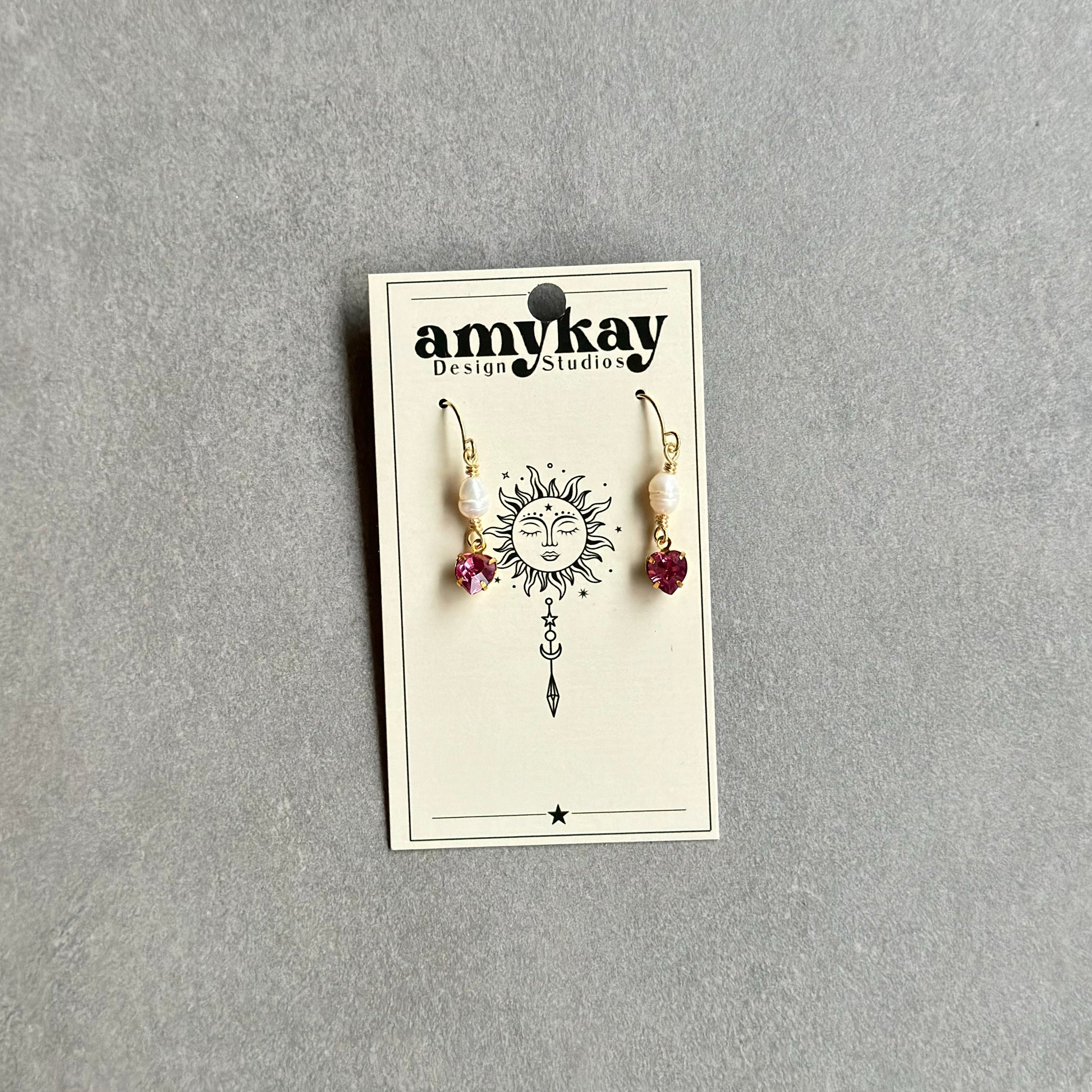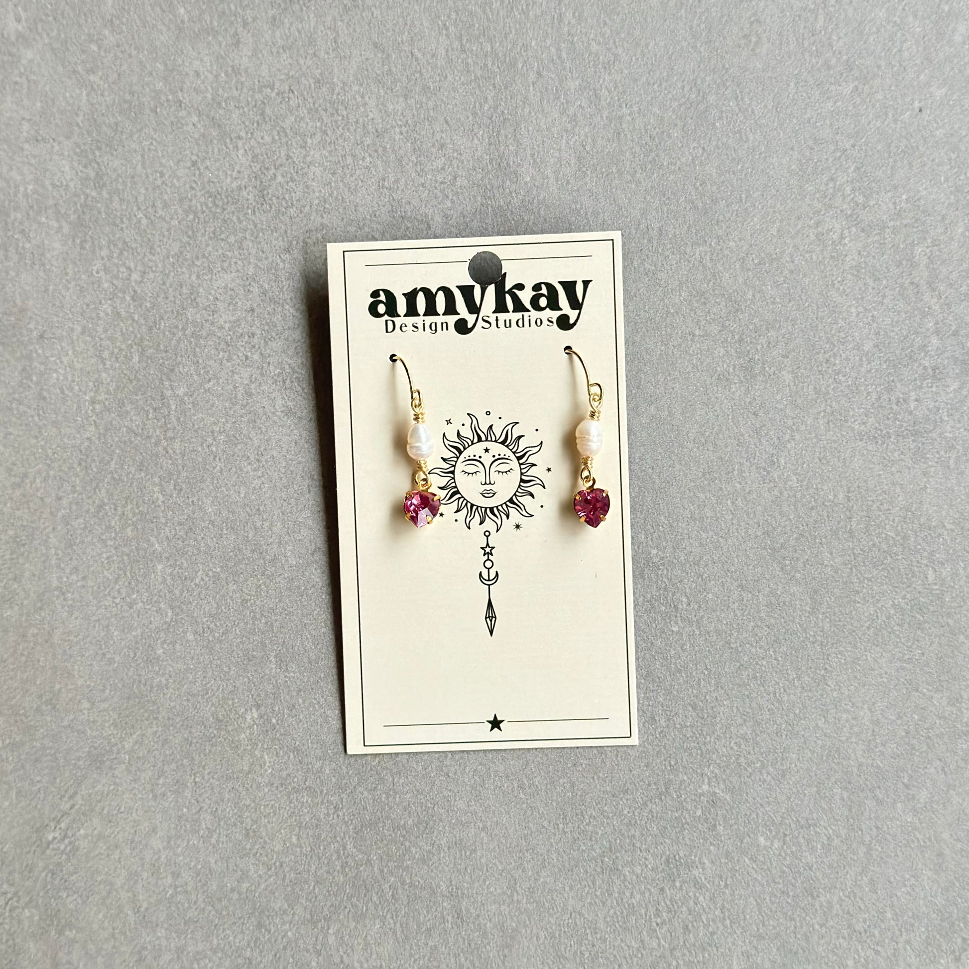 Handmade earrings made with freshwater pearls, vintage heart crystals, and gold plated hooks