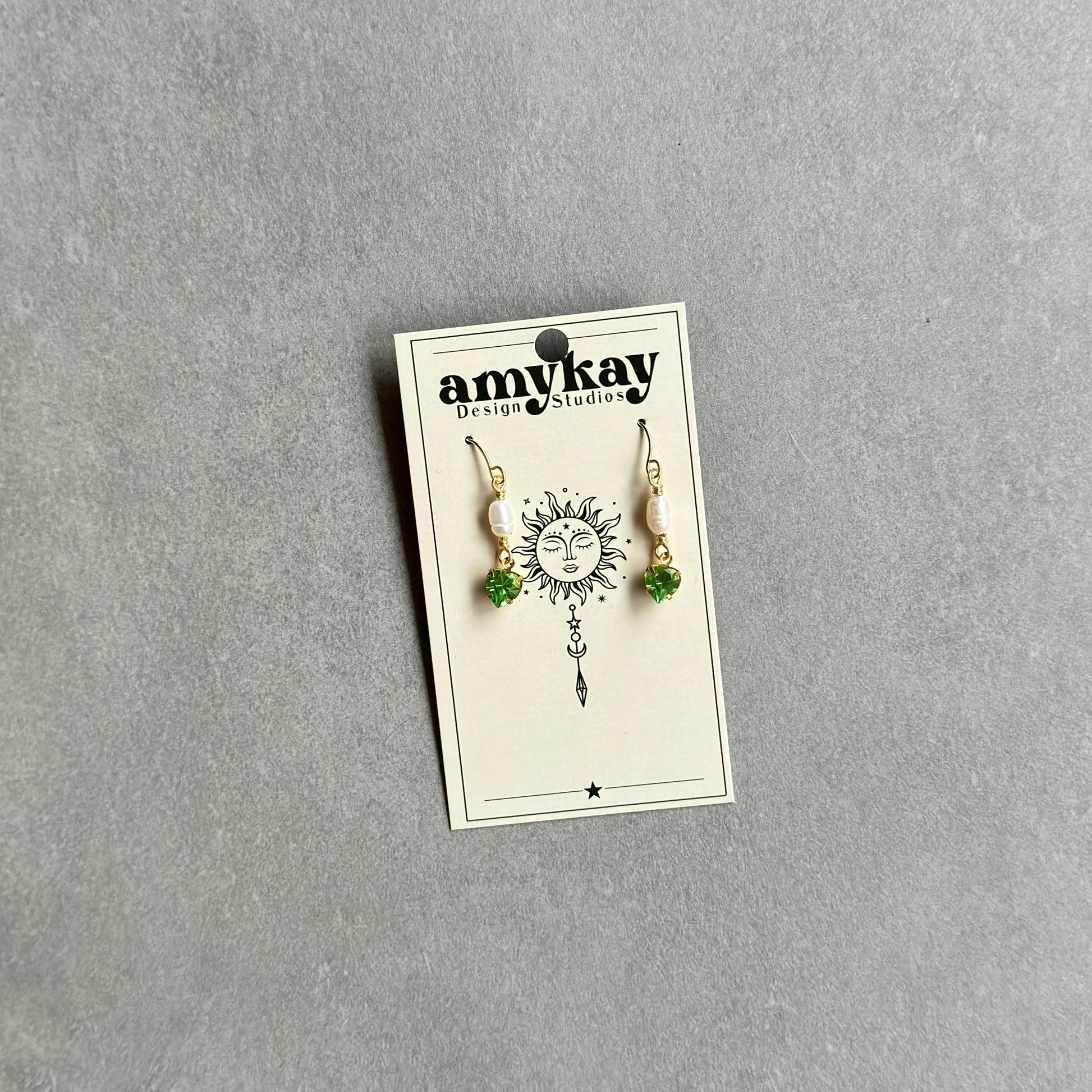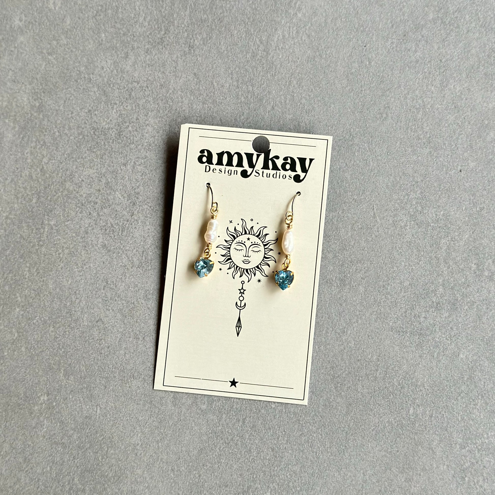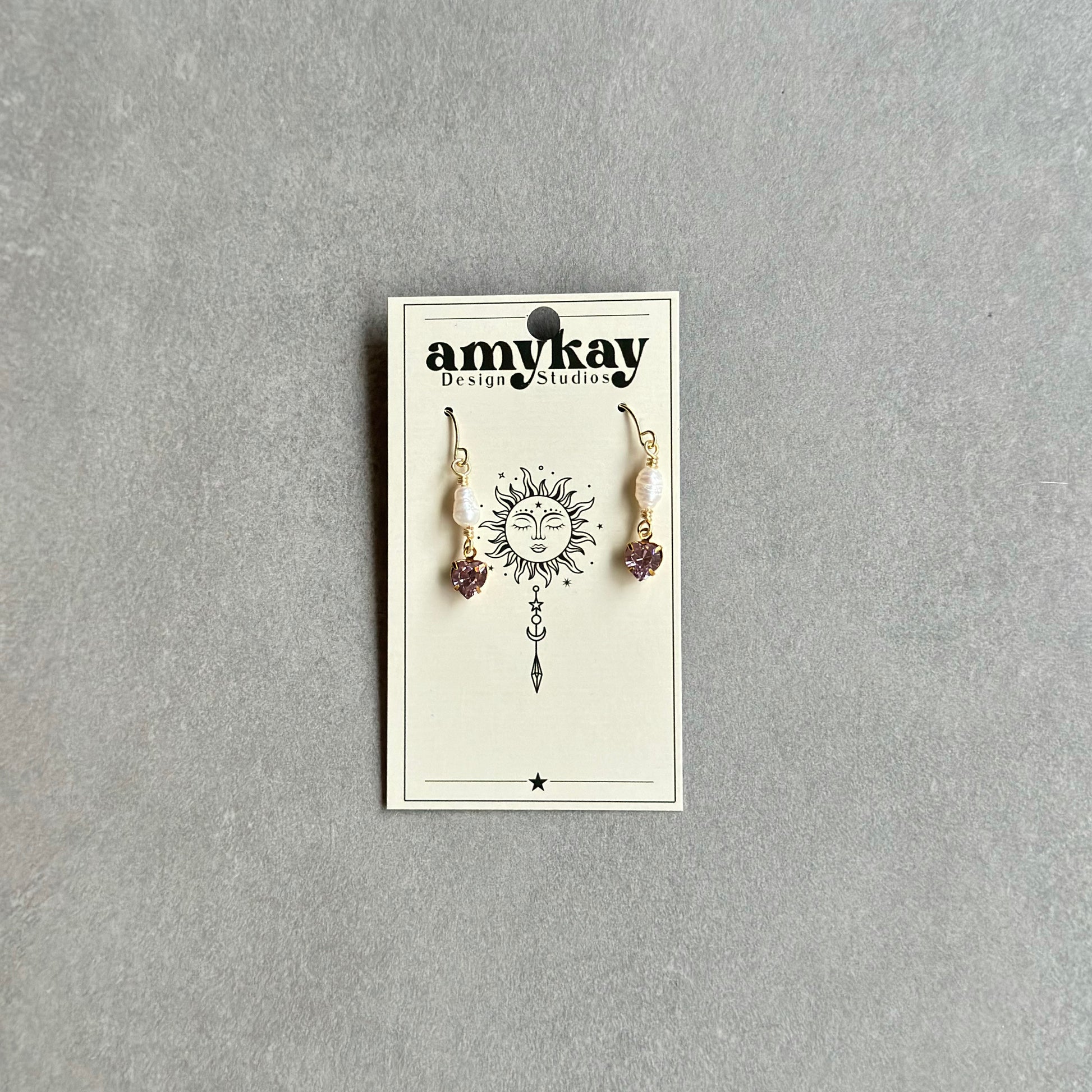 Handmade earrings made with freshwater pearls, vintage heart crystals, and gold plated hooks