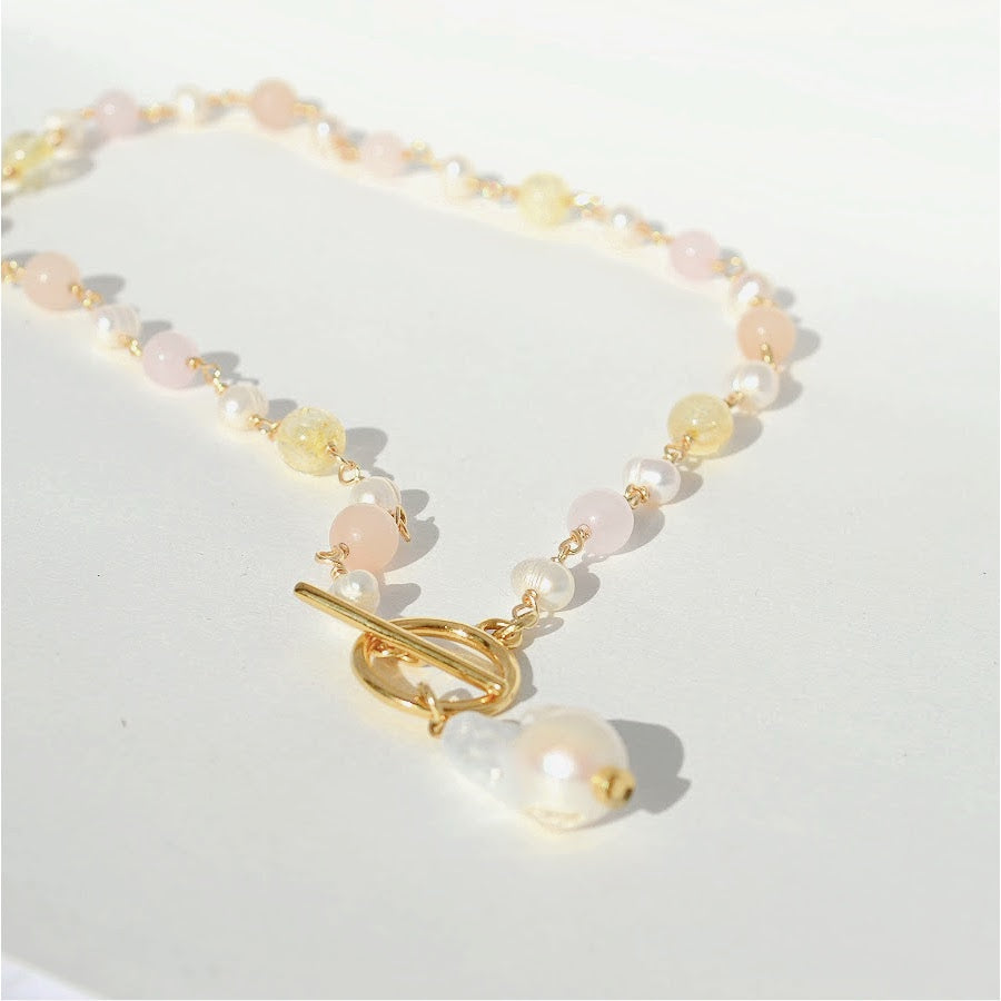 Handmade necklace made with rose quartz, pink opal, citrine, freshwater pearls, and gold plated findings