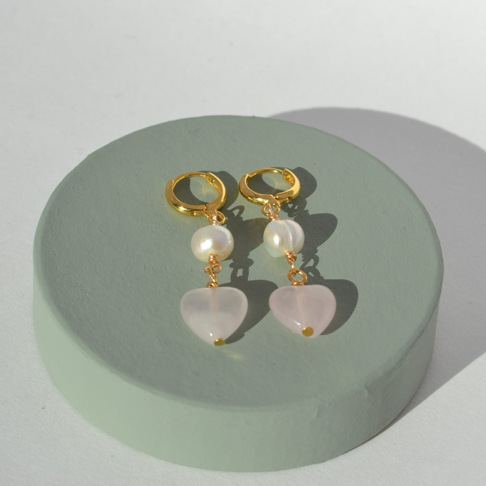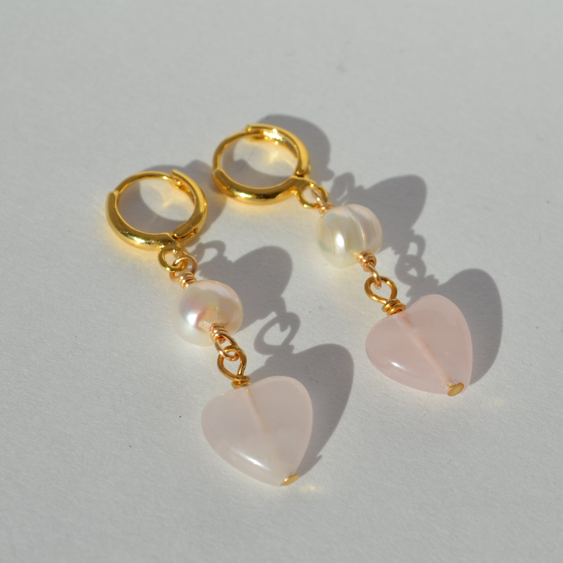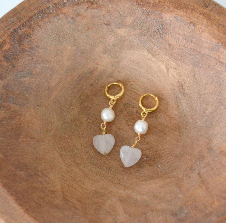 Handmade huggie earrings made with freshwater pearls, rose quartz hearts, and gold plated hoops