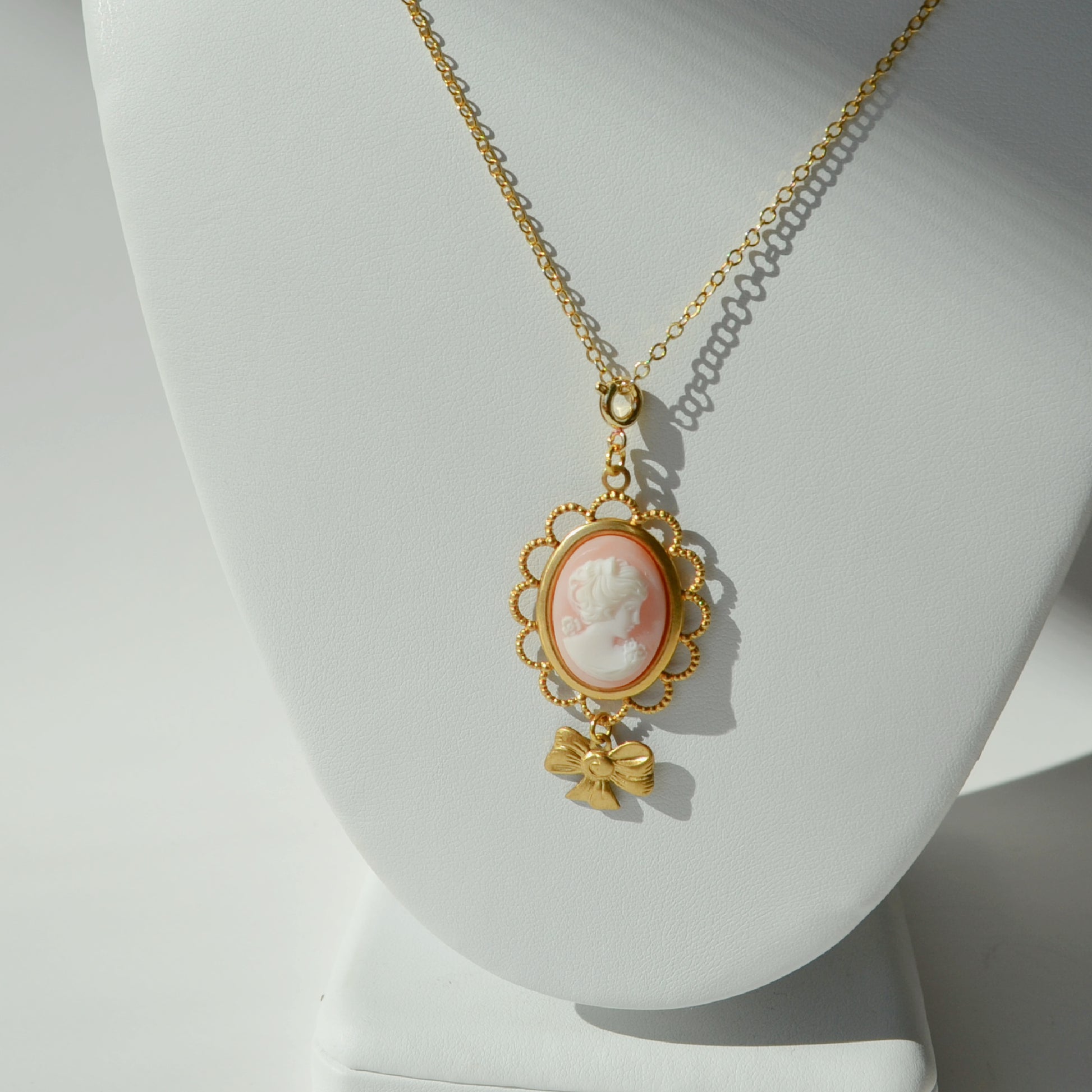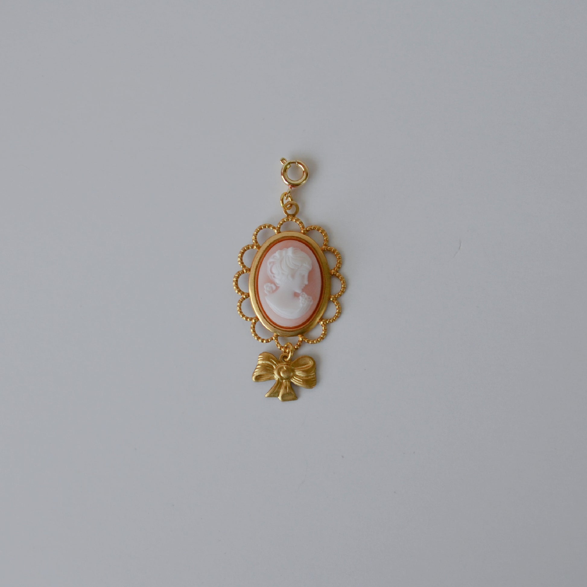 1 pink cameo in a filigree setting with a dangling bow charm