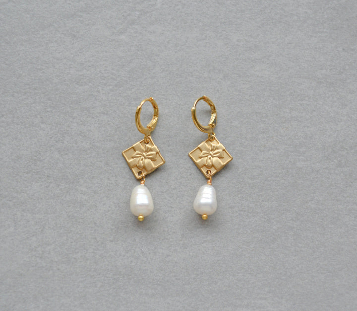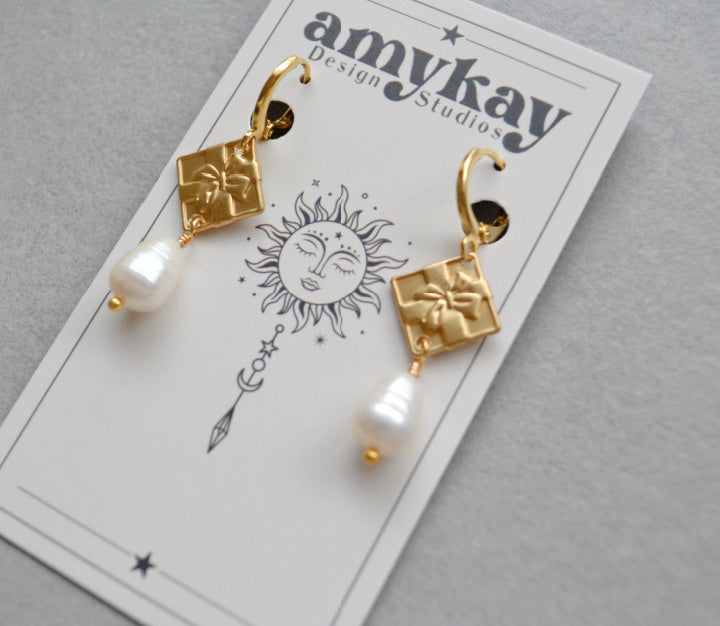 Huggie earrings made with teardrop freshwater pearls, vintage brass gift wrapped present charms , and gold plated hoops