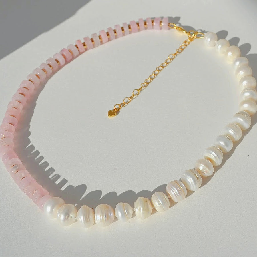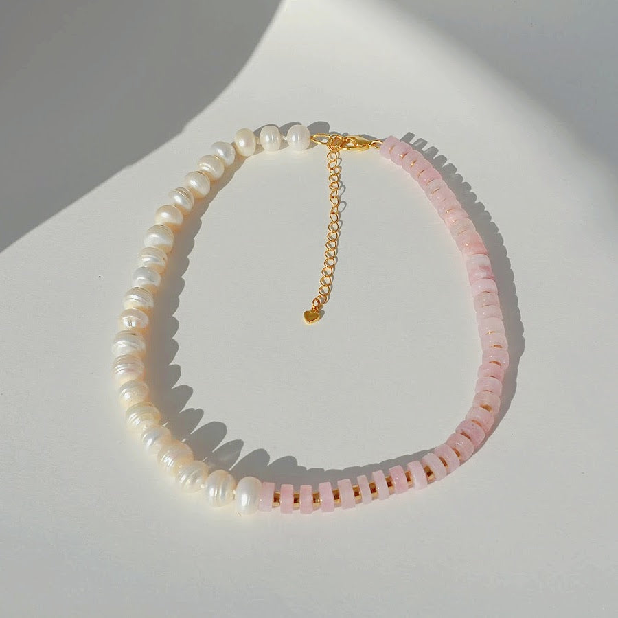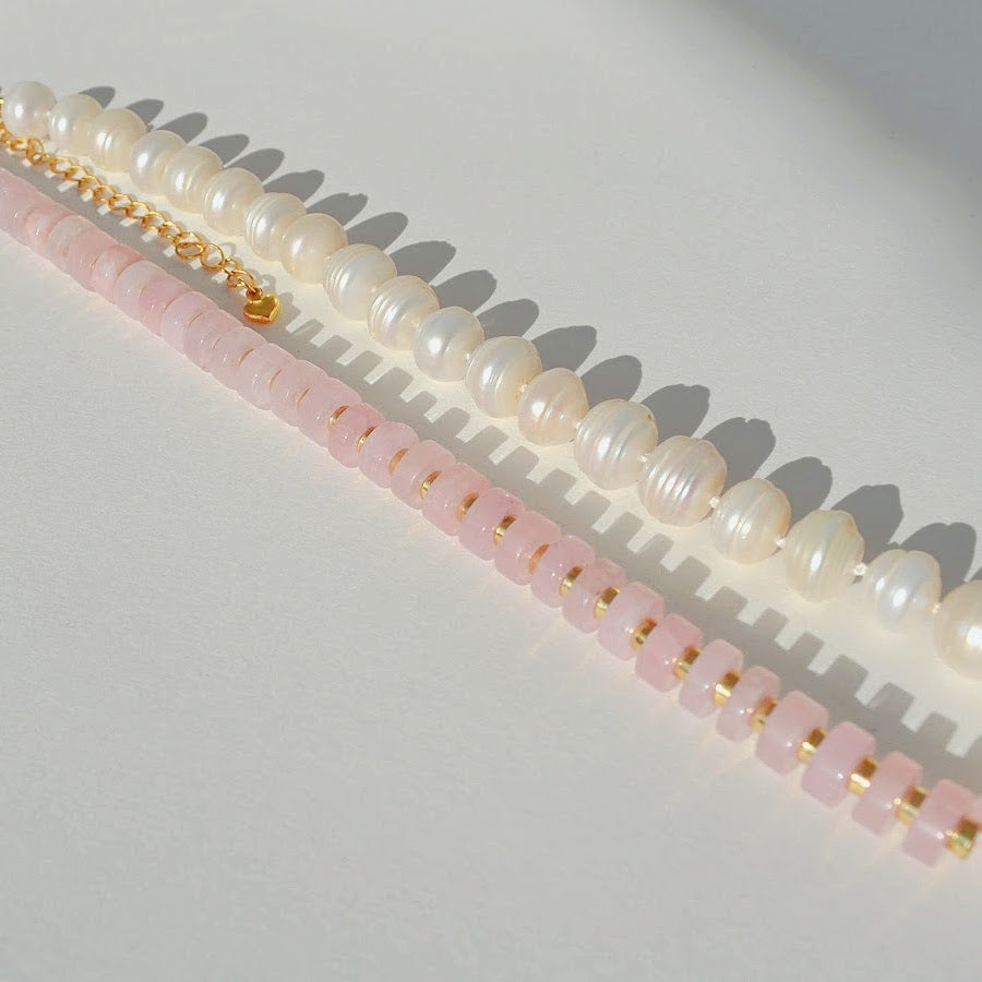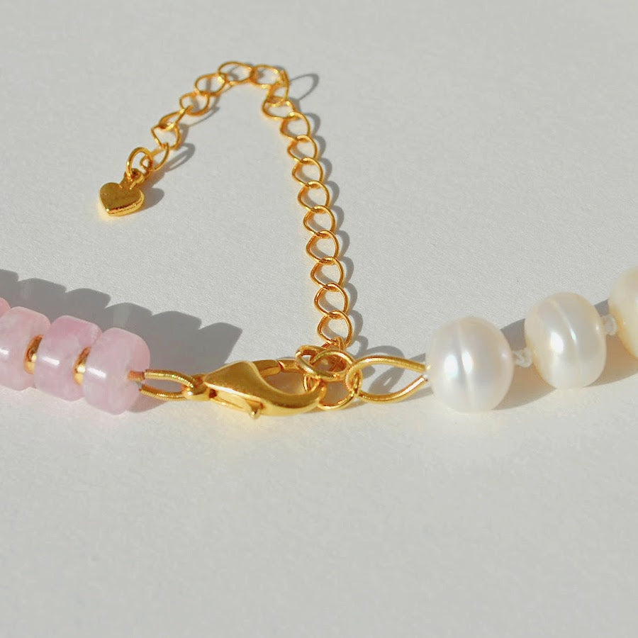 Handmade necklace made with rose quartz and freshwater pearls hand knotted on silk with gold plated findings