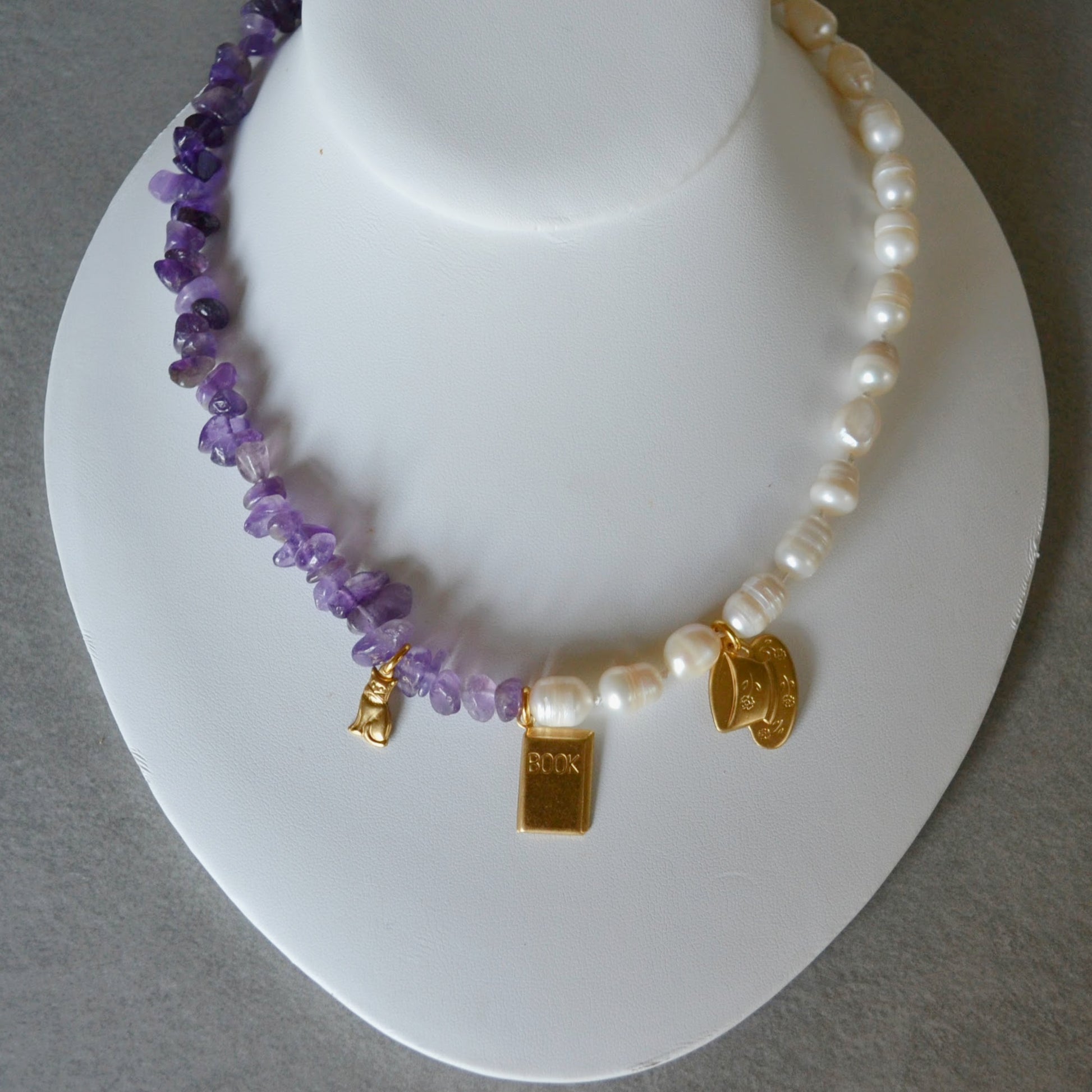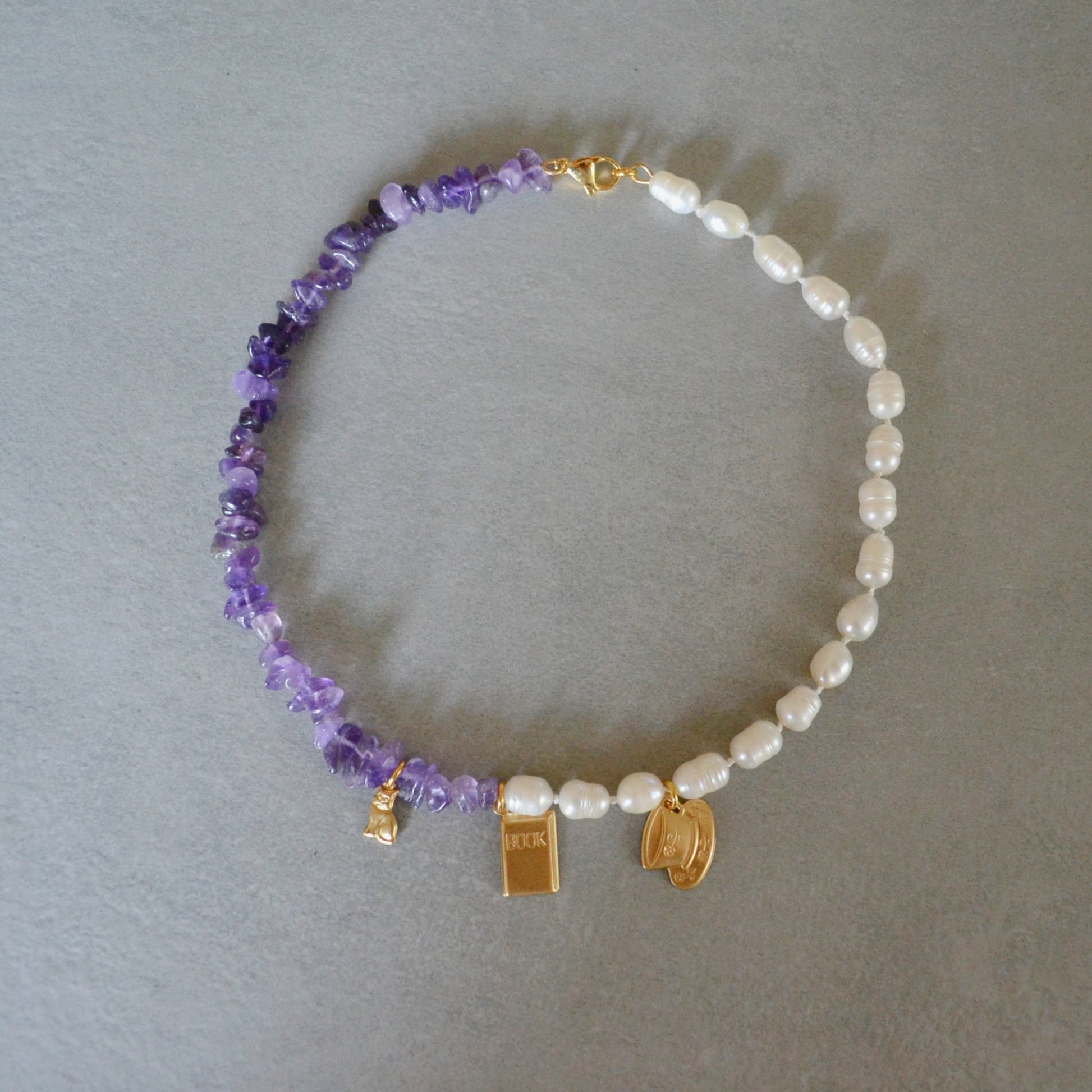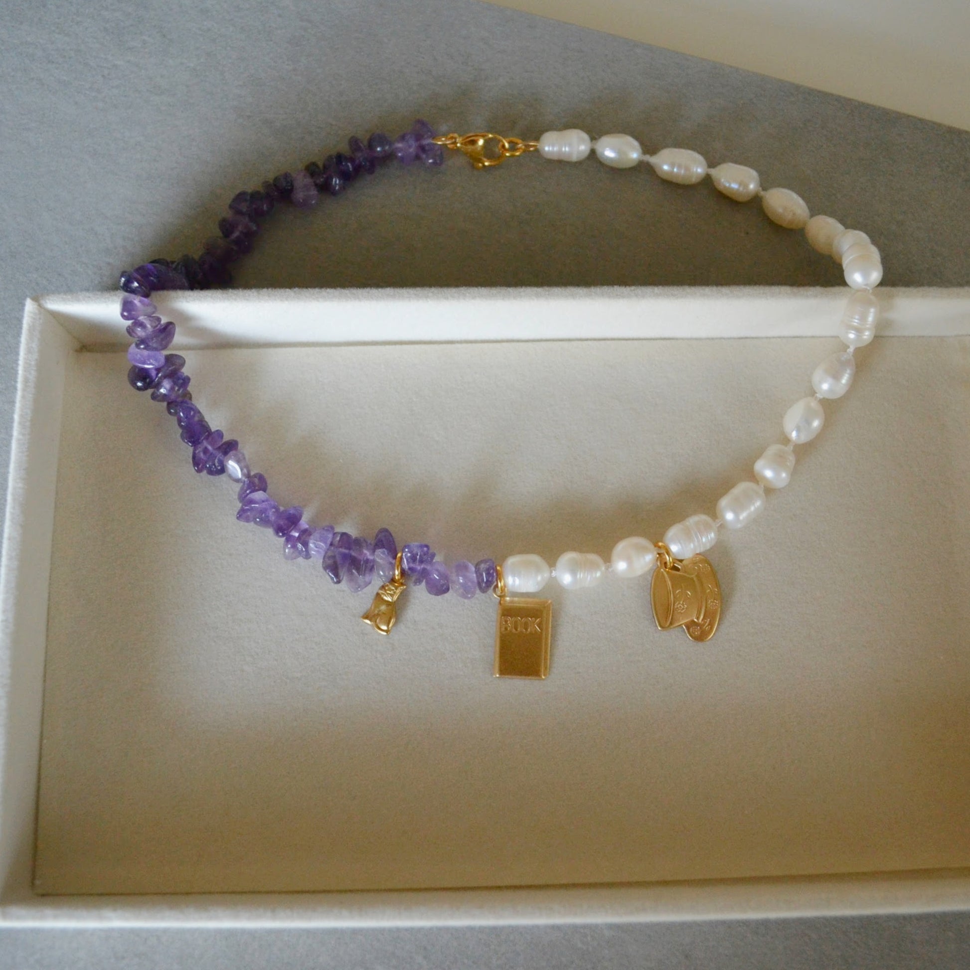 From our "That Girl" collection, each necklace celebrates a different version of that girl—this one is for the booktoker. Featuring three vintage charms, freshwater pearls, and amethyst beads, all hand-knotted onto silk thread, this necklace offers a fresh twist on the timeless string of pearls.The BookToker necklace is perfect for that girl who spends all her free time scrolling on BookTok or curled up with a cat in her lap, a cup of tea, and her nose in a book.