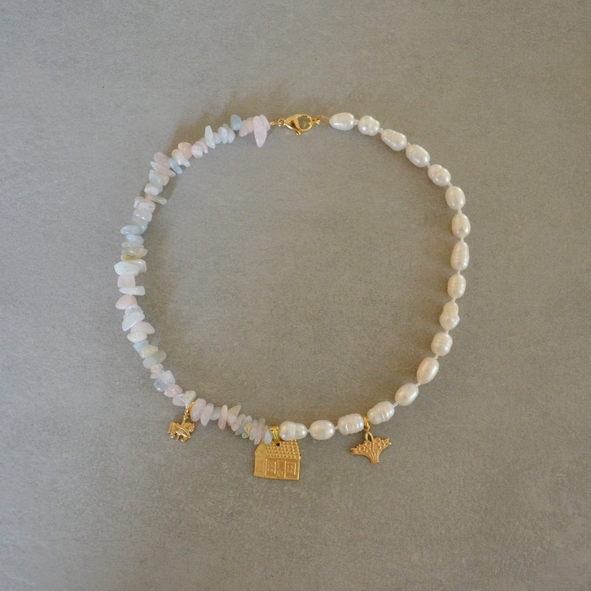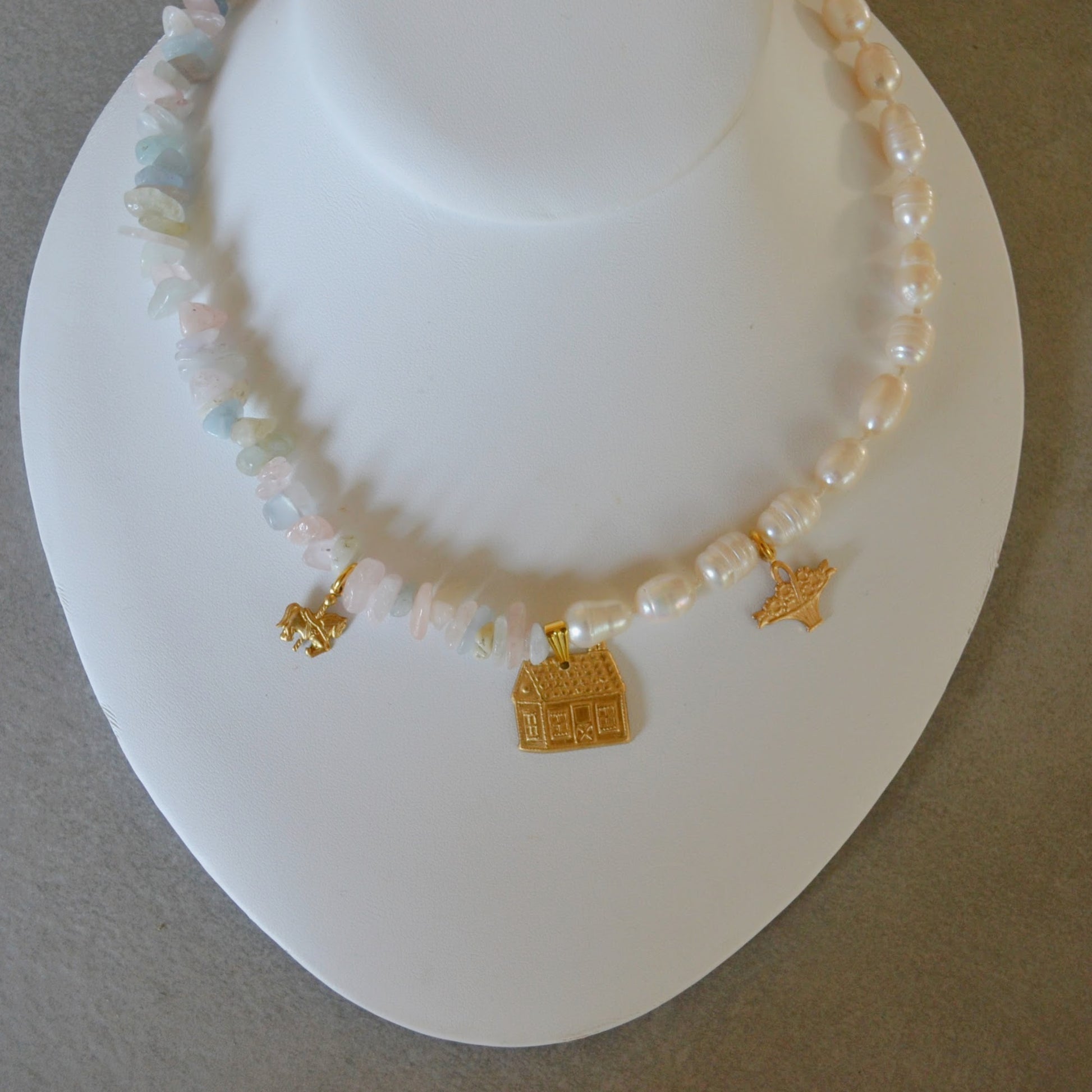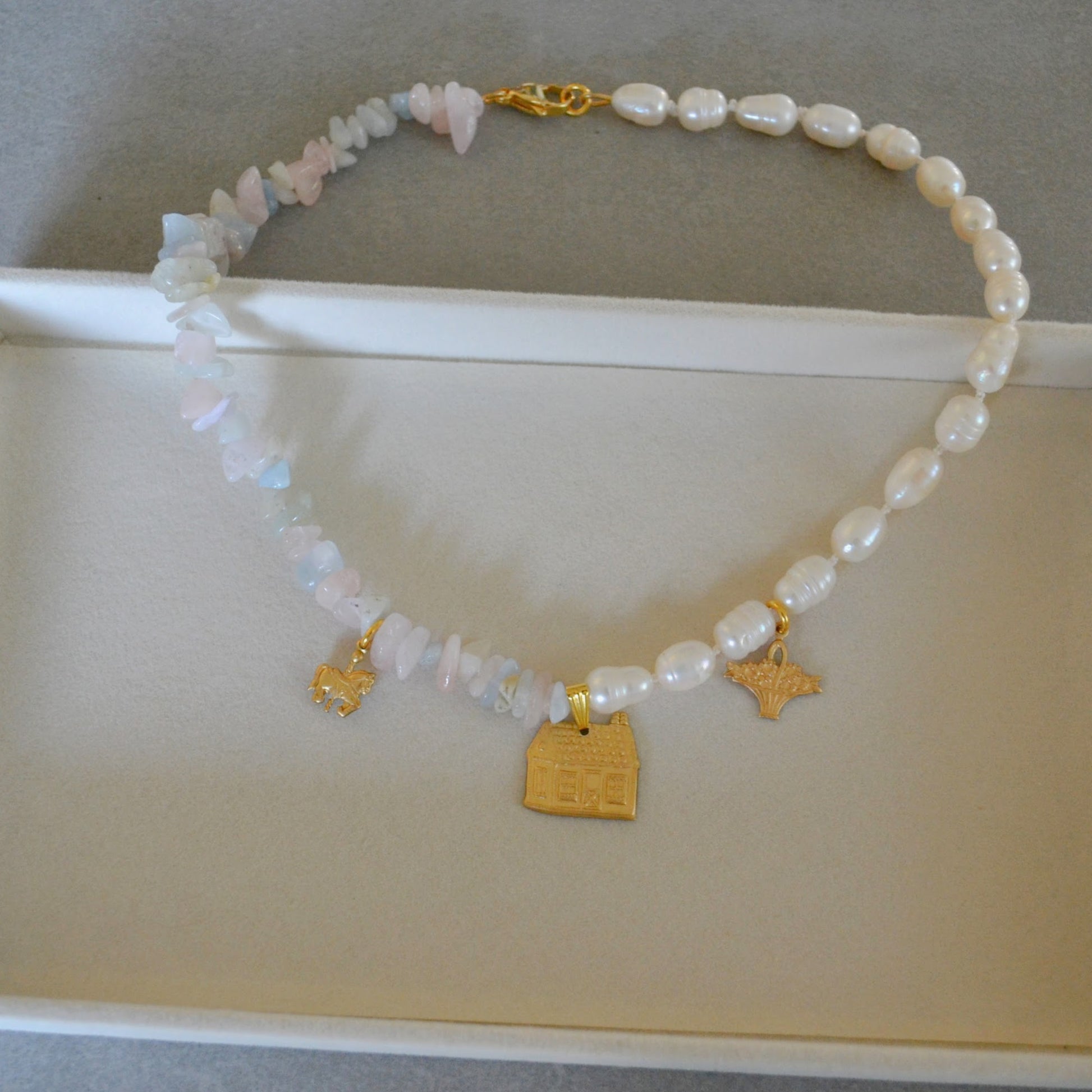 From our "That Girl" collection, each necklace celebrates a different version of that girl—this one is for the Cottagecore girl. Featuring three vintage charms, freshwater pearls, and morganite beads, all hand-knotted onto silk thread, this necklace offers a fresh twist on the timeless string of pearls.The Cottagecore necklace is for that girl who loves cozy cottages, blooming gardens, and the charm of whimsical lifestyle.