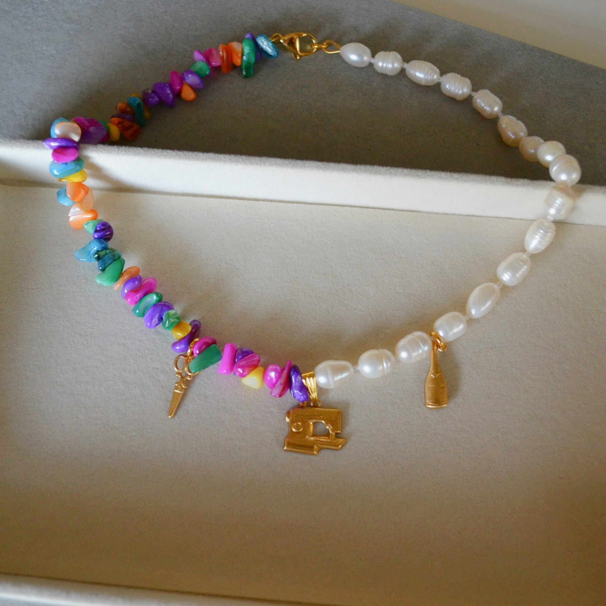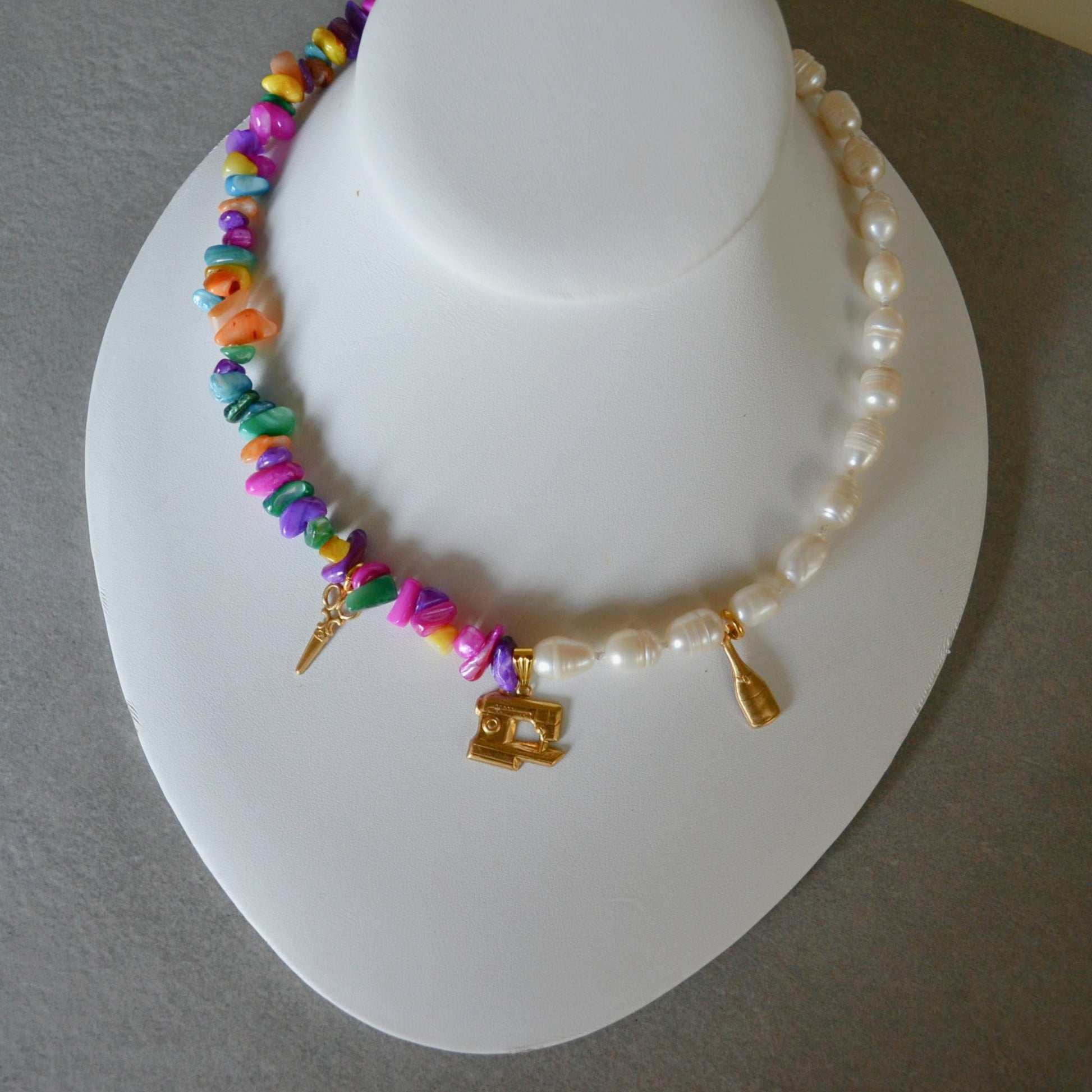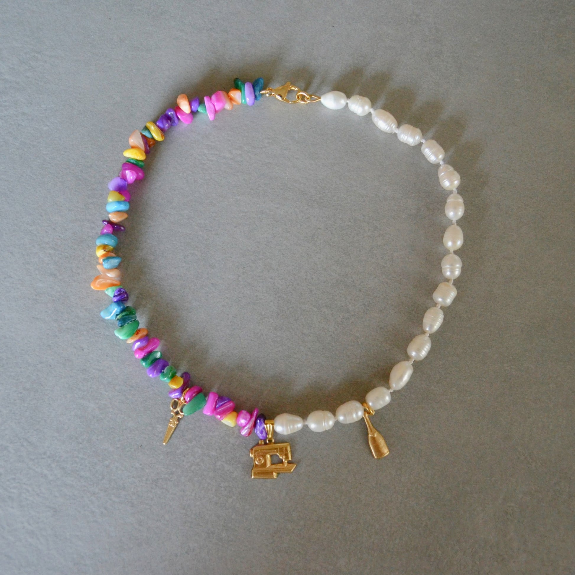 From our "That Girl" collection, each necklace celebrates a different version of that girl—this one is for the Crafty Girl. Featuring three vintage charms, freshwater pearls, and colorful shell beads, all hand-knotted onto silk thread, this necklace offers a fresh twist on the timeless string of pearls. The Crafty Girl necklace is perfect for those who love a night in, crafting something new with a glass (or a bottle) of wine in hand.