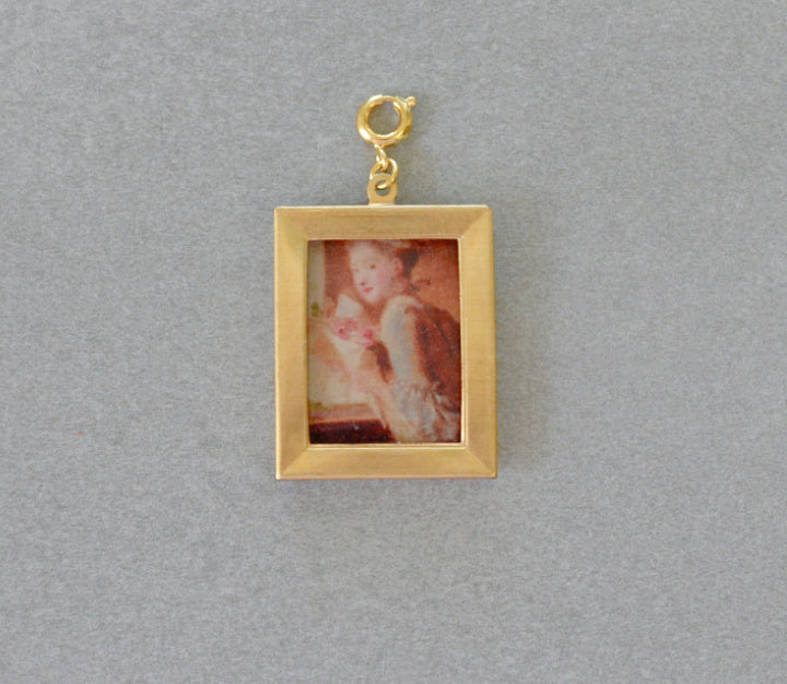 1 brass frame charm with a miniature painting of The Love Letter by Jean Honoré Fragonard