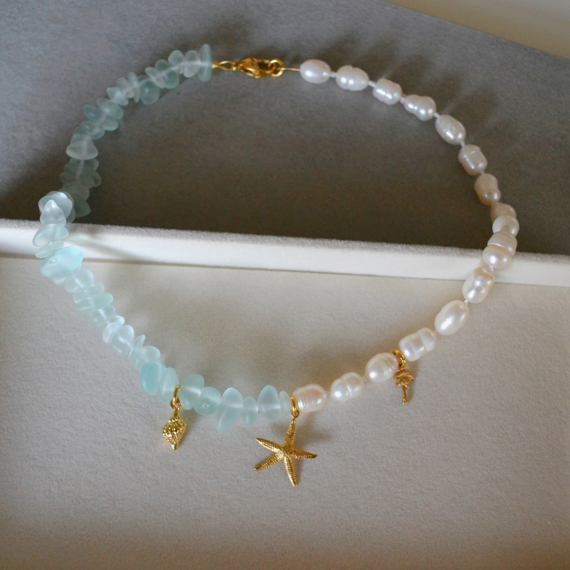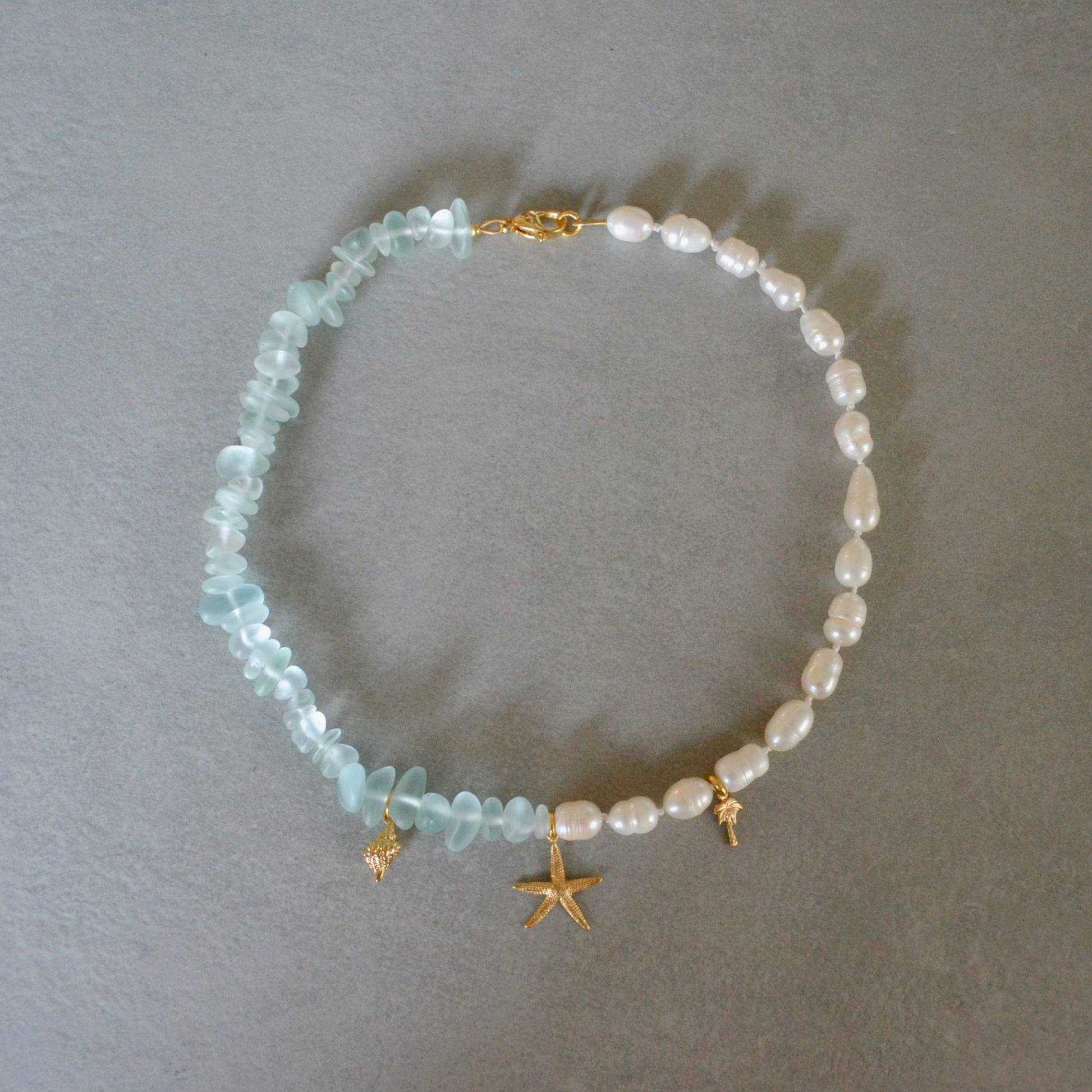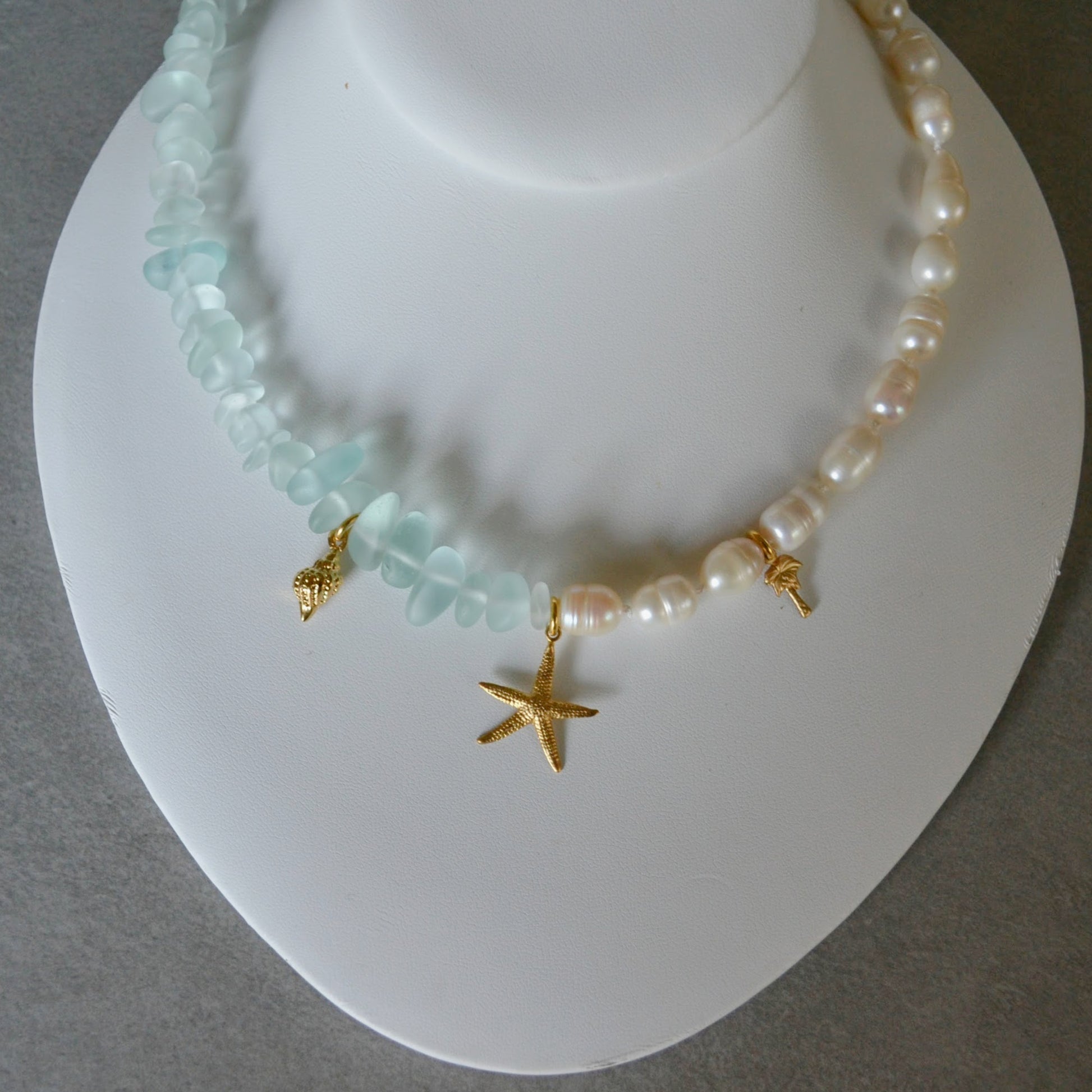 - Freshwater Pearls and Seaglass Beads: Hand-knotted on silk thread