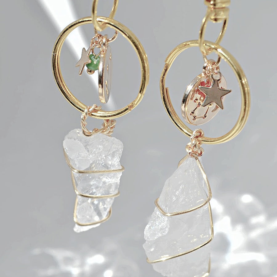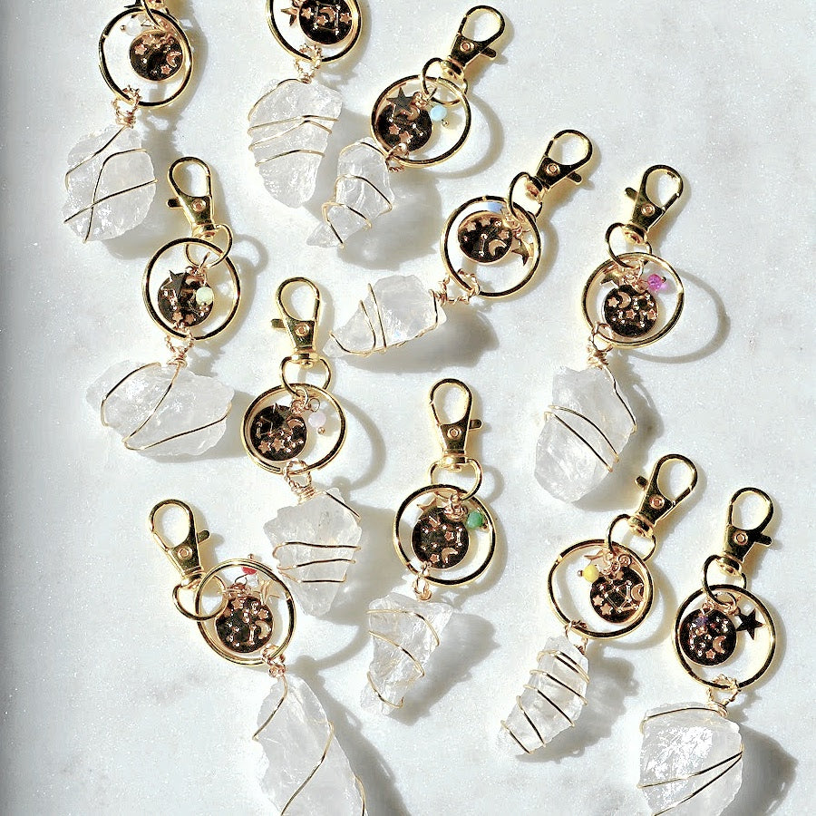 Handmade wire wrapped quartz keychain with a zodiac charm and swivel clip